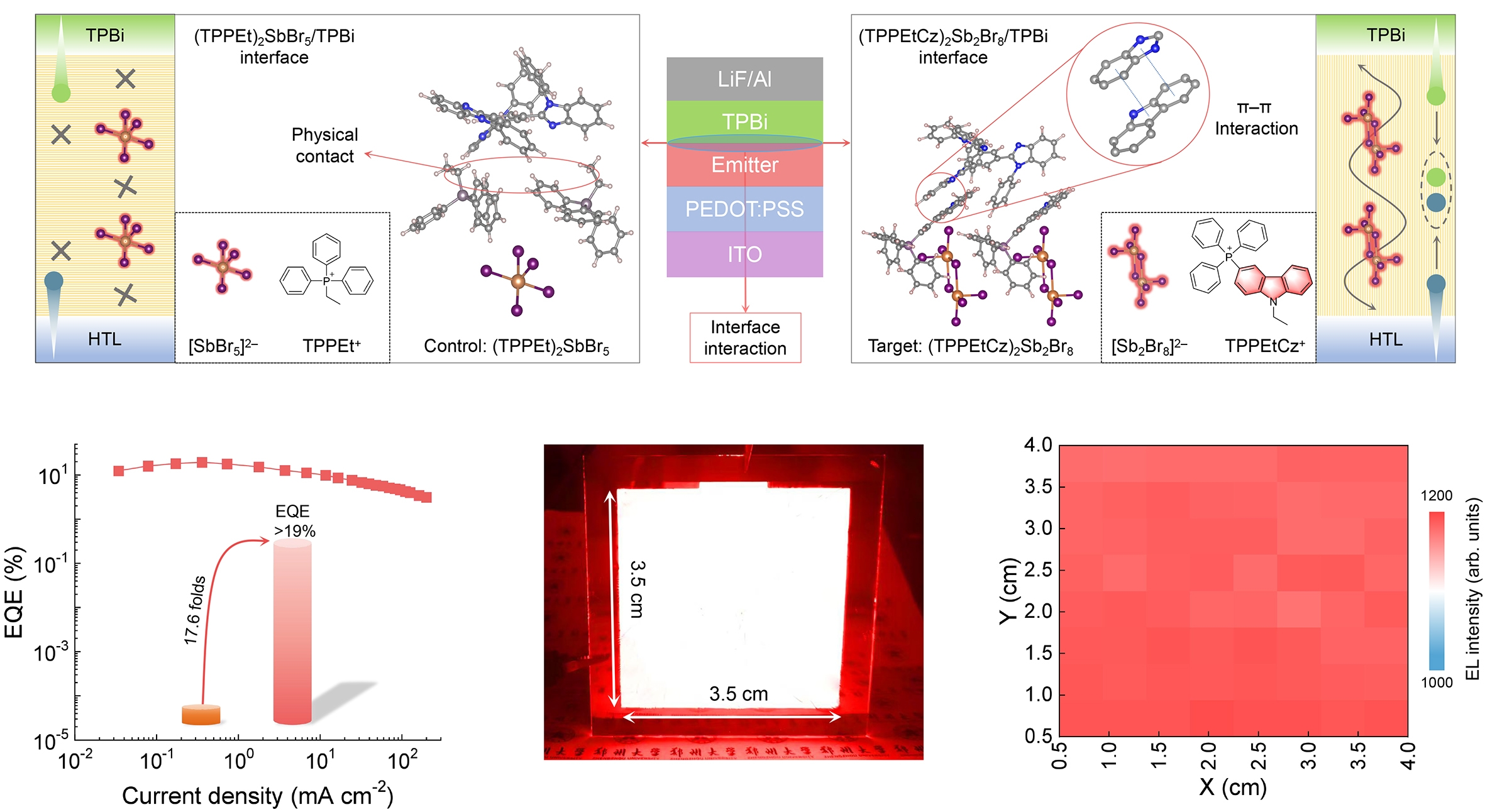 针对上述问题,我院研究人员在分子层面出发,提出一种全新的有机阳离子设计策略,构建了咔唑功能化的有机阳离子。该阳离子一方面能够与无机卤化物框架和溶剂分子形成强氢键相互作用,有效调控薄膜结晶动力学,从而获得致密、均匀、低缺陷密度的高质量发光层;另一方面,其咔唑单元可与电子传输层中的苯并咪唑结构产生显著的π-π堆积作用,改善界面能级匹配和分子耦合,促进电子在界面处的高效传输与注入。在材料发光性能提升与界面工程优化的协同作用下,研究团队成功制备出高性能锑卤化物LED器件,最大外量子效率达到19.4%,工作半衰期达到10190分钟,较以往报道水平实现了跨越式提升。这一成果不仅大幅缩小了光致发光效率与电致发光效率之间的差距,也为有机无机杂化金属卤化物在高效、稳定LED中的应用奠定了重要基础。