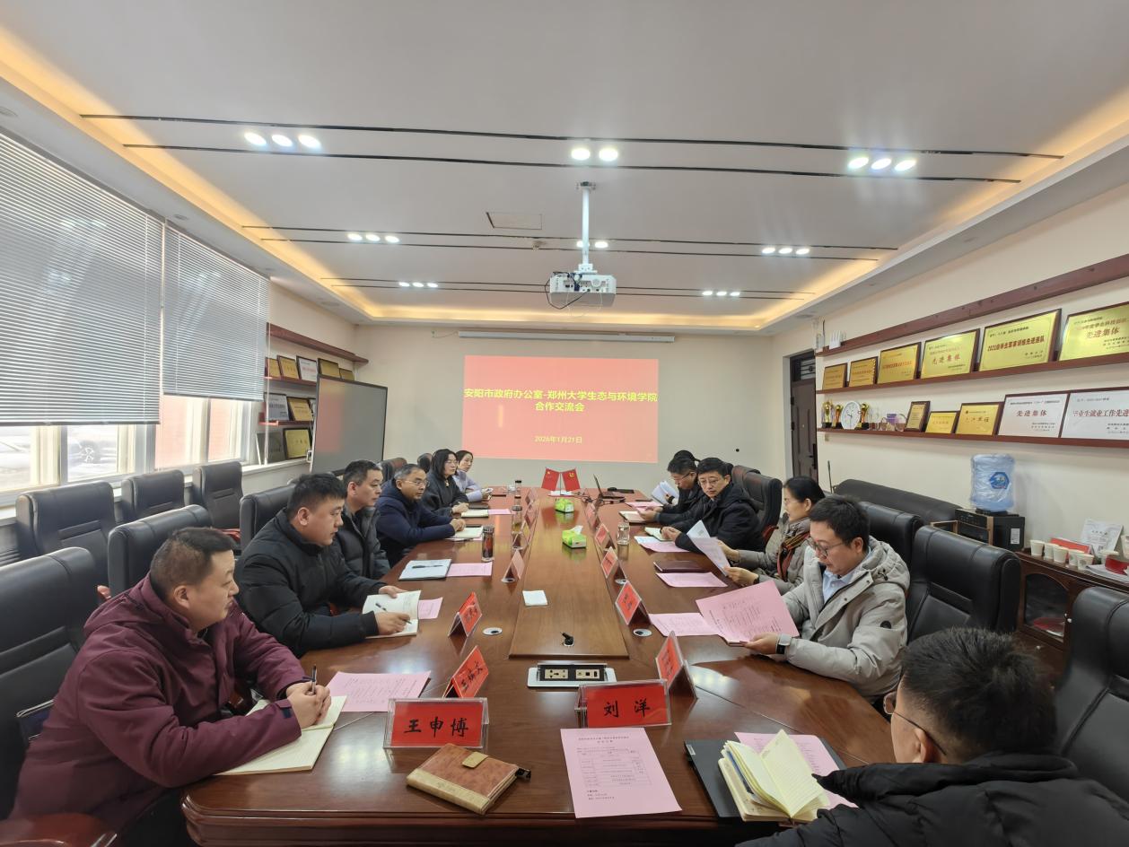 2026年1月21日上午,安阳市政府办公室一行赴郑州大学生态与环境学院开展合作交流。安阳市政府办公室副秘书长、办公室主任齐宏阳,安阳市发展研究中心副主任薛刚汉及安阳市生态环境局等部门工作人员参加调研;我院党委书记张彤军,执行院长、党委副书记窦明,副院长张伟,学科带头人张瑞芹教授,以及大气、固废研究方向的教师代表多人参加本次合作座谈会。
