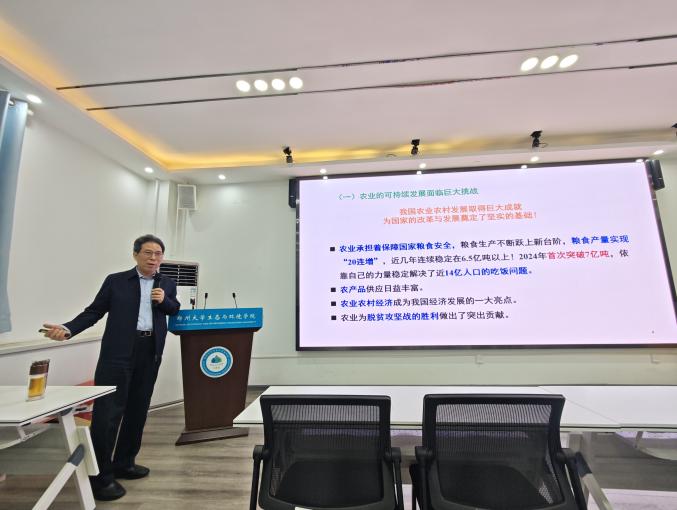 2026年1月30日上午,生态环境部对外合作与交流中心原首席专家朱留财研究员、湖石可持续发展研究院院长胡涛研究员、农业农村部农业生态与资源保护总站原副站长高尚宾研究员应邀来到郑州大学生态与环境学院,围绕全球气候变化、减排政策及农业绿色低碳转型等前沿议题作专题讲座。讲座由郑州大学生态与环境学院副院长赵楠教授主持,学院教师和博士、硕士研究生共计40余人聆听了讲座。