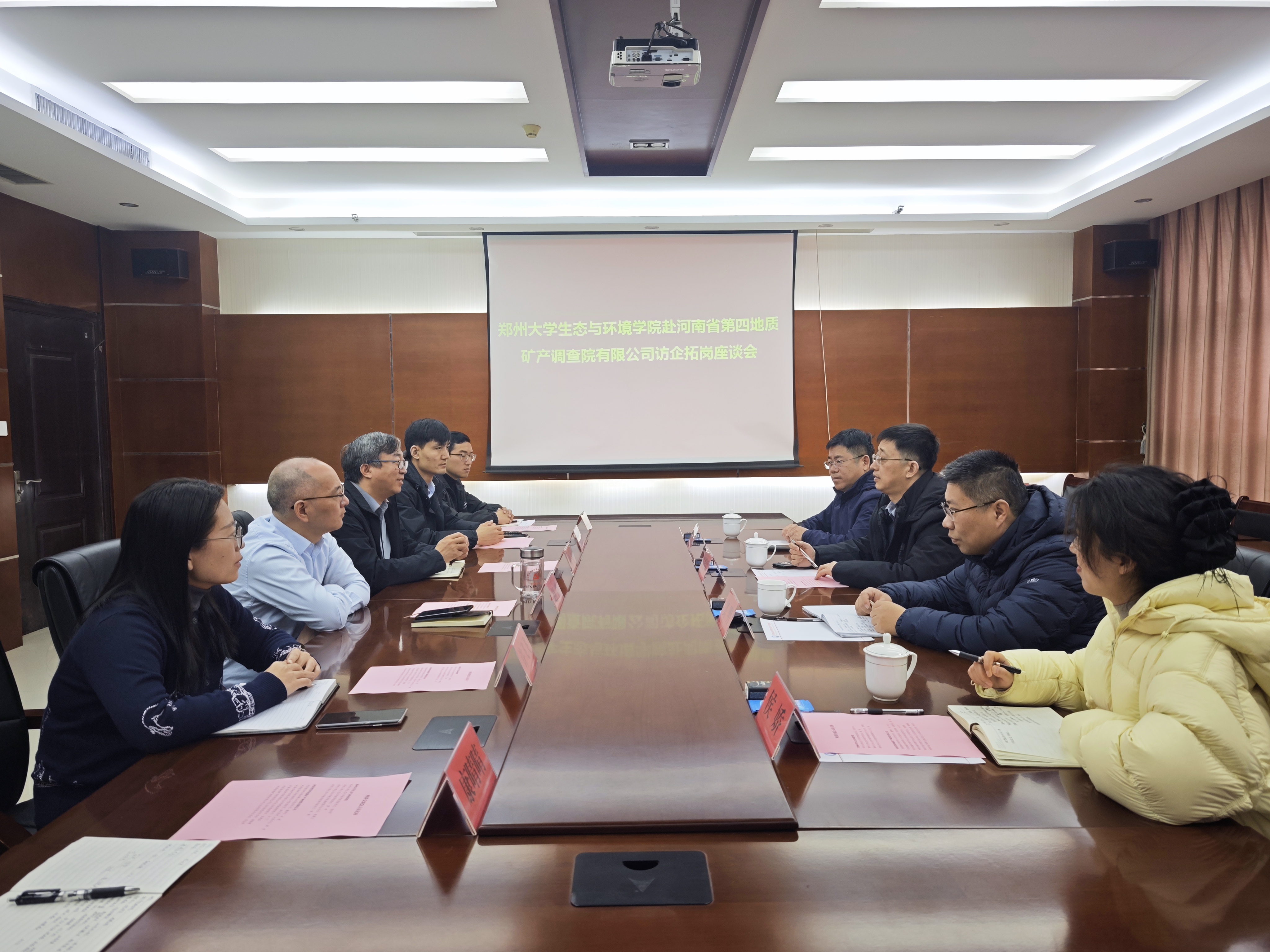 3月4日,学院党委书记张彤军、执行院长窦明、教授委员会主任李顺义及研究生工作高级主管侯姣一行,前往河南省第四地质矿产调查院有限公司走访,受到公司党委书记赵煜、副总经理周建及我院毕业校友热情接待。座谈会上,张彤军致谢并介绍学院发展近况与育人特色,窦明围绕科研平台建设、成果转化等内容交流探讨。双方聚焦科研项目合作、人才定向输送、实习基地共建等议题深入研讨,达成广泛合作共识,现场正式签订战略合作框架协议。后续双方将在科研协作、人才培养、成果转化等领域深度合作,携手服务生态环境保护与区域高质量发展,在岗校友也结合职场经验为学院育人工作提供了实践参考。