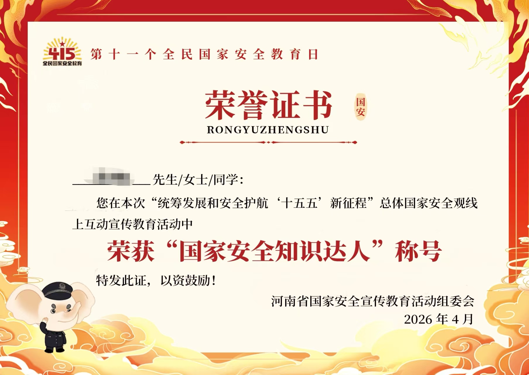 4月10日,学院组织师生线上观看总体国家安全观互动宣教视频,围绕“统筹发展和安全护航‘十五五’新征程”主题,系统学习国家安全核心要义,强化“国家安全无小事”的思想认识。参与互动的师生均获得了河南省国家安全宣传教育活动组委会颁发的“国家安全知识达人”荣誉证书。