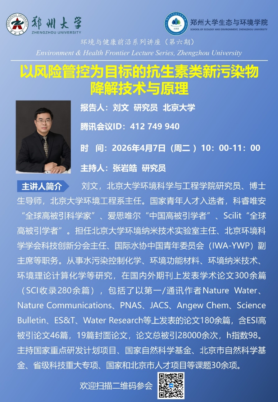 在全球环境与健康研究快速发展的趋势下,为深入贯彻习近平总书记“绿水青山就是金山银山”的生态文明思想与“黄河流域生态保护和高质量发展”的战略部署,郑州大学生态与环境学院邀请行业顶尖专家倾情分享,举办《环境与健康前沿》系列讲座。讲座主题紧扣时代脉搏,覆盖新污染物、公共安全、环境毒理、环境催化、人工智能等方向,契合国家战略,对标国际前沿,打造环境与健康领域高水平学术平台。