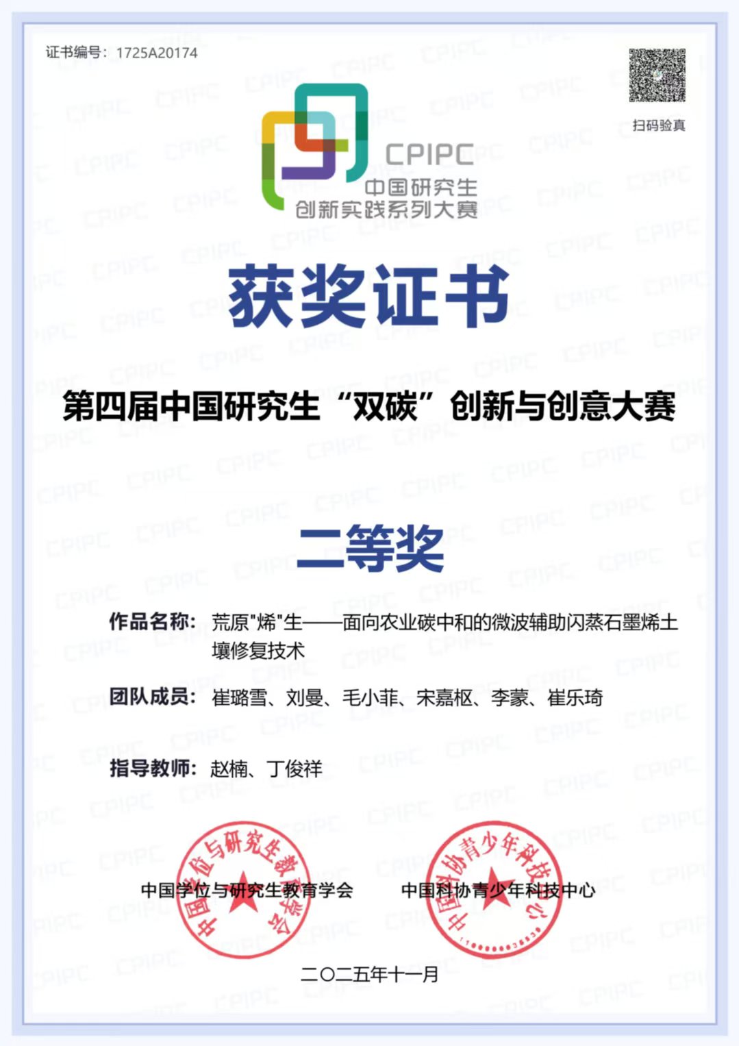 近日,第四届中国研究生“双碳”创新与创意大赛在沈阳化工大学举办决赛,在激烈角逐后,由我院赵楠老师和丁俊祥老师共同指导的项目“面向农业碳中和的微波辅助闪蒸石墨烯土壤修复技术”项目,一路过关斩将荣获国家二等奖。农业碳中和是“双碳”战略的重要组成部分,而土壤污染治理与碳汇提升是其中的关键难题。“烯望田野联盟”团队聚焦这一痛点,历经多轮实验攻关,创新研发出微波辅助闪蒸石墨烯土壤修复技术。该技术将石墨烯材料的高吸附性与微波闪蒸的高效性相结合,在修复重金属污染、改良土壤结构的同时,能提升土壤固碳能力,实现“修复+固碳”双重功效,为农业绿色低碳发展提供了全新解决方案。生态与环境学院研究生崔璐雪、刘曼、毛小菲、宋嘉枢、李蒙和崔乐琦为该项目主要成员。大家一起查阅海量文献、扎根实验室反复调试,多次深入田间地头开展实地调研与技术验证。从方案设计到原型搭建,从数据优化到效果实测,团队成员分工协作、攻坚克难,在导师的悉心指导下,不断完善技术细节,最终形成了兼具创新性与实用性的成熟方案。