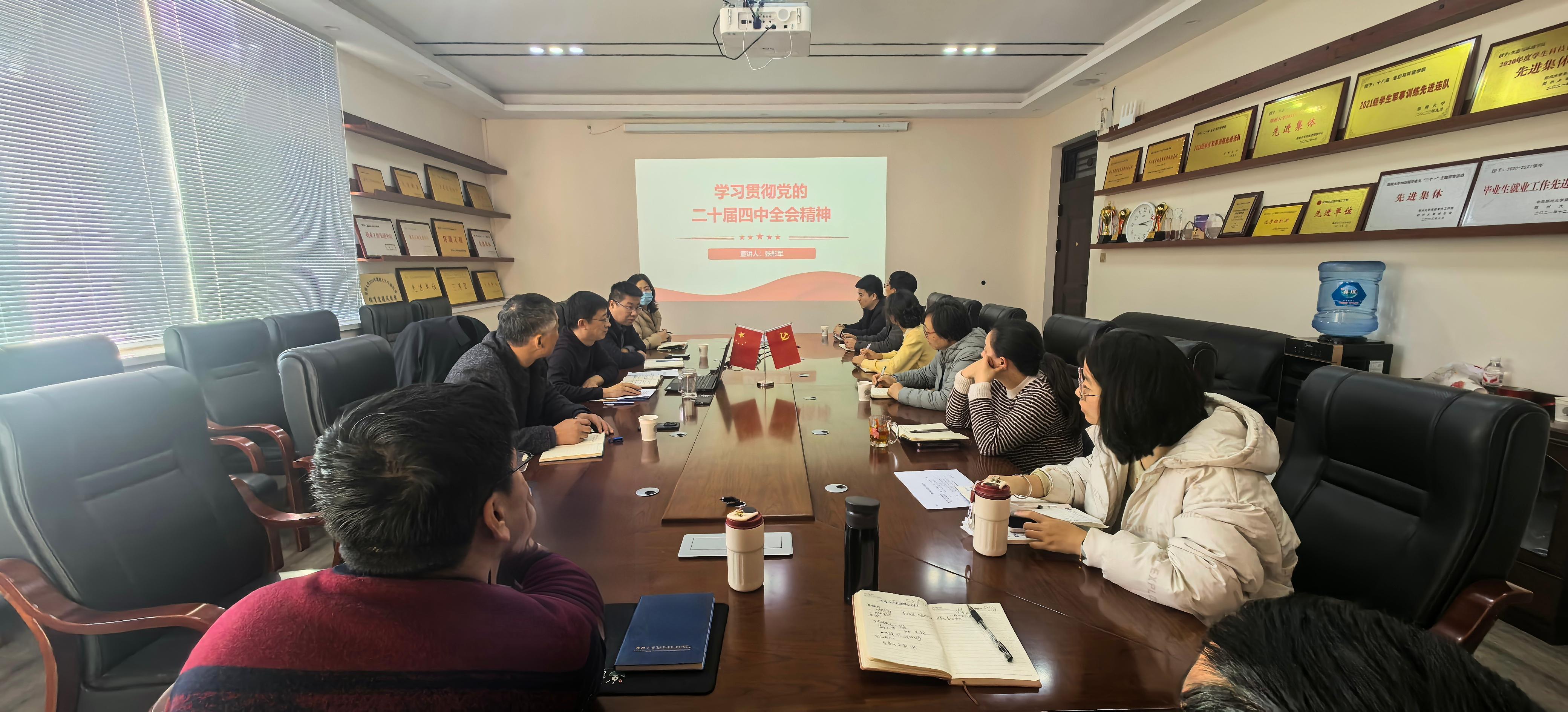 会上,全体参会人员集体学习了习近平总书记重要讲话、二十届四中全会公报、《中共中央关于制定国民经济和社会发展第十五个五年规划的建议》中关于生态文明建设的重要论述。会议指出,党的二十届四中全会擘画了推进国家治理体系和治理能力现代化的宏伟蓝图,明确提出美丽中国建设取得新的重大进展的目标任务。全院上下要深刻领会全会精神的核心要义,切实把学习成果转化为推动学院高质量发展、助力学校建设的内生动力。