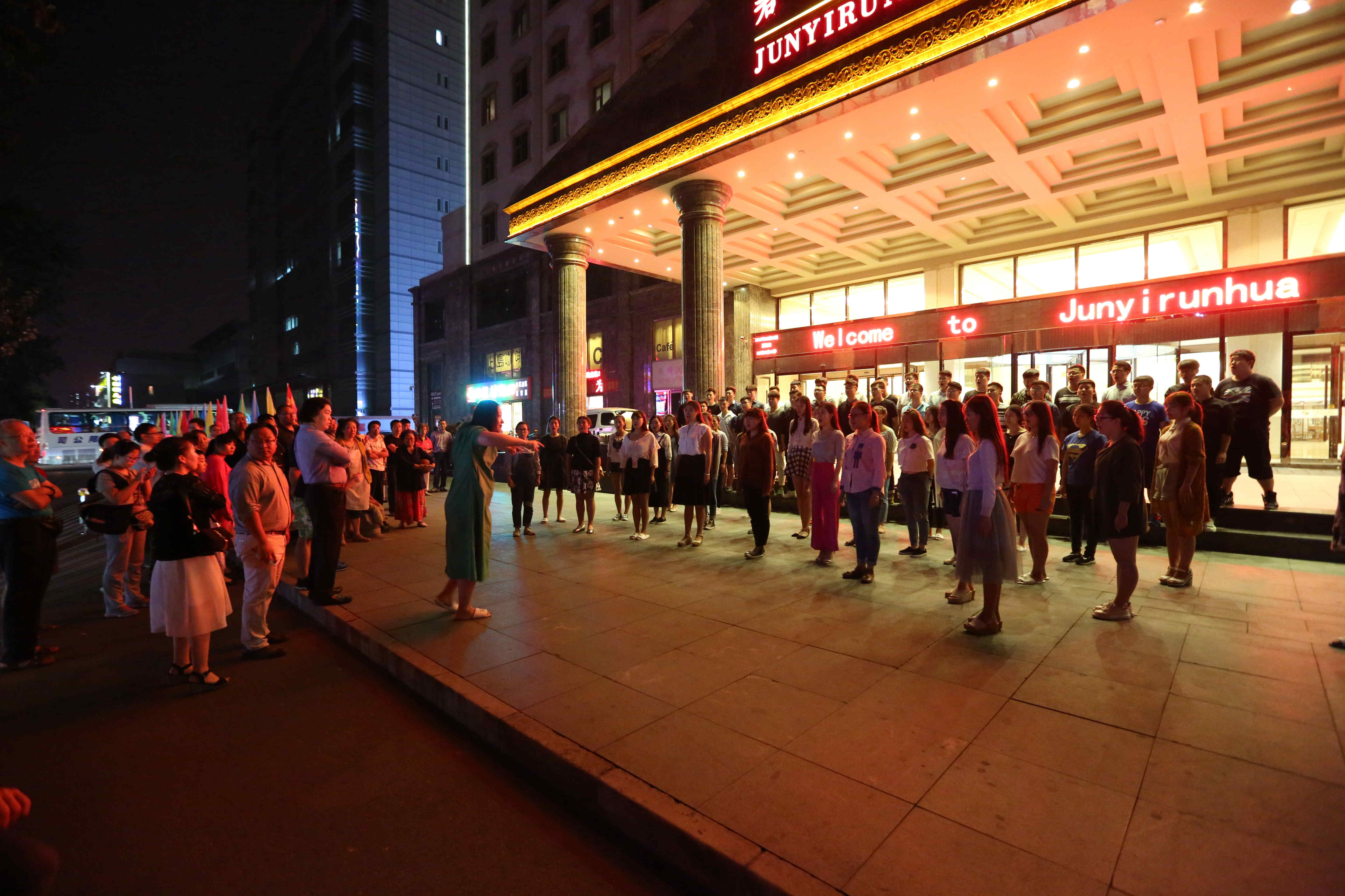 合唱团于赛前在宾馆门前排练