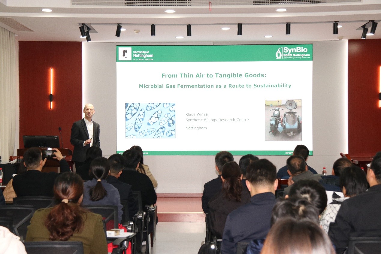 Klaus Winzer副教授在郑州大学药学院进行了题目为《From Thin Air to Tangible Goods: Microbial Gas Fermentation as a Route to Sustainability》《从稀薄的空气到高价值产品:微生物气体发酵的可持续发展路径》的英文报告,系统介绍了通过代谢工程改造梭菌等微生物,优化梭菌遗传工具,最终运用梭菌,以空气中的CO2、甲烷等为原料,合成高价值产品。