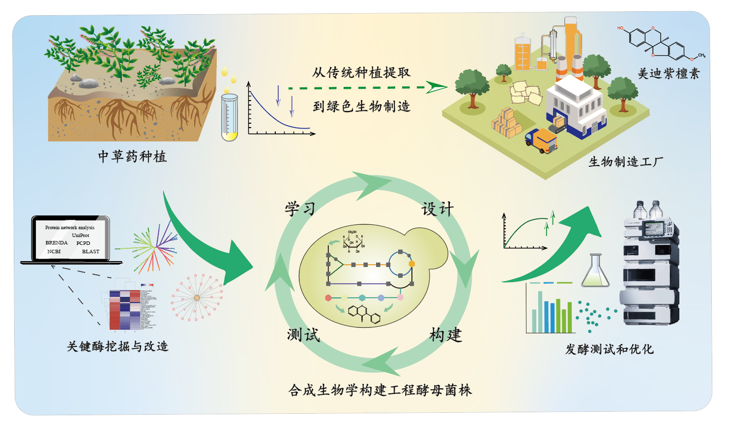 该研究不仅实现了美迪紫檀素的微生物从头合成,也为其他结构复杂的植物源活性成分的生物制造提供了新思路与技术范式。研究过程中,团队通过系统优化前体供给、酶催化效率及代谢通量平衡,充分展现了多学科交叉融合在合成生物学研究中的重要作用。