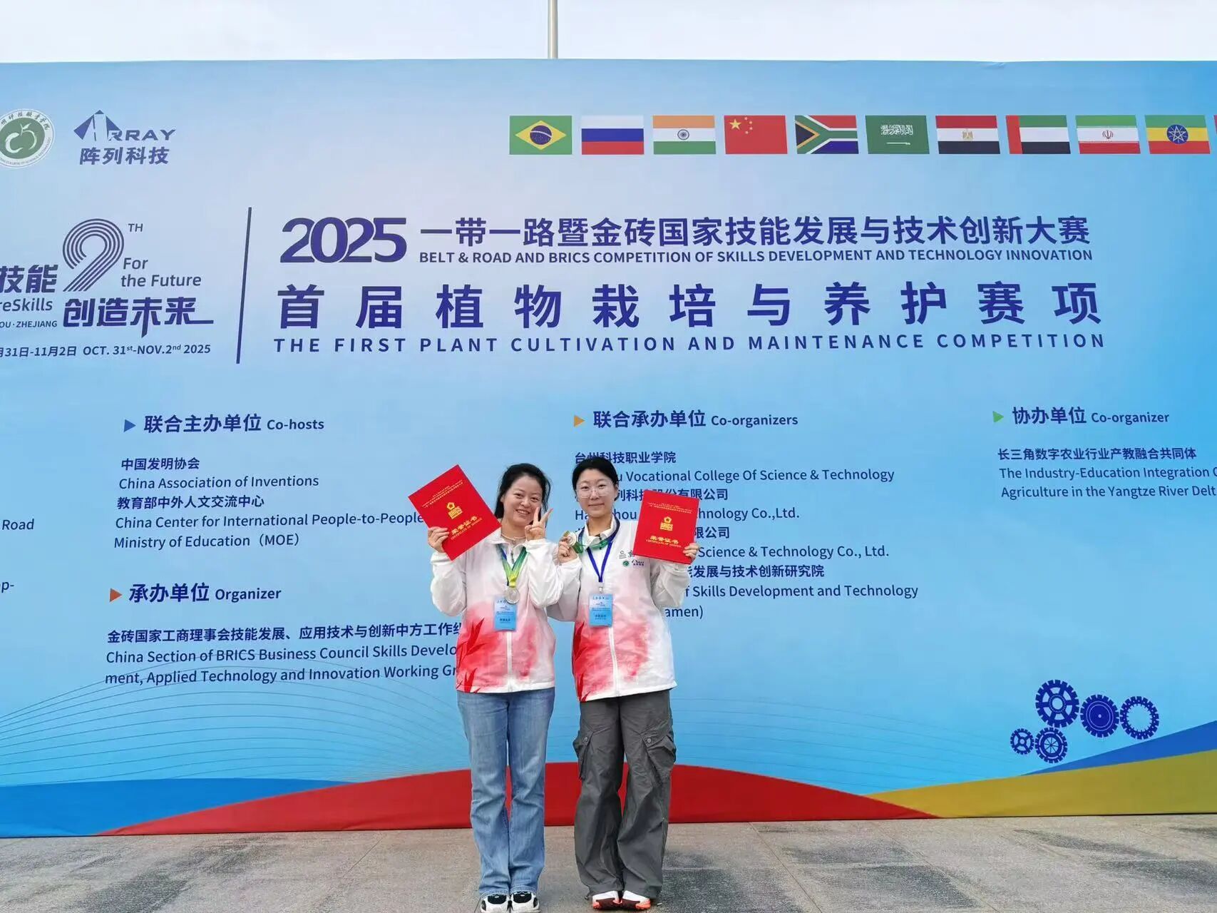 近日,“2025一带一路暨金砖国家技能发展与技术创新大赛”在浙江省台州科技职业学院顺利收官。我院风景园林专业2024级学生班代婧、刘畅报名参加植物栽培与养护赛项。在陈怡霖、崔逸文两位老师的指导下,历经多日专项备赛,于10月31日至11月2日的竞赛中稳定发挥,斩获大赛银奖,为我院赢得荣誉。