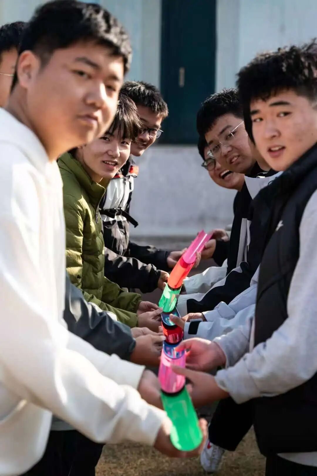 本次素质拓展设置了多项富有趣味性和挑战性的团队项目。在“贪吃蛇大作战”中,队员们通过指令互信,成功集结;“千里传珠”考验了团队的精准配合与耐心;“一圈到底”则展现队员们的灵活与创意;“过河搭桥”环节,紧张有序的接力充分体现高效协作的重要性。整个操场气氛热烈,同学们在互动中拉近彼此距离,筑牢集体意识。