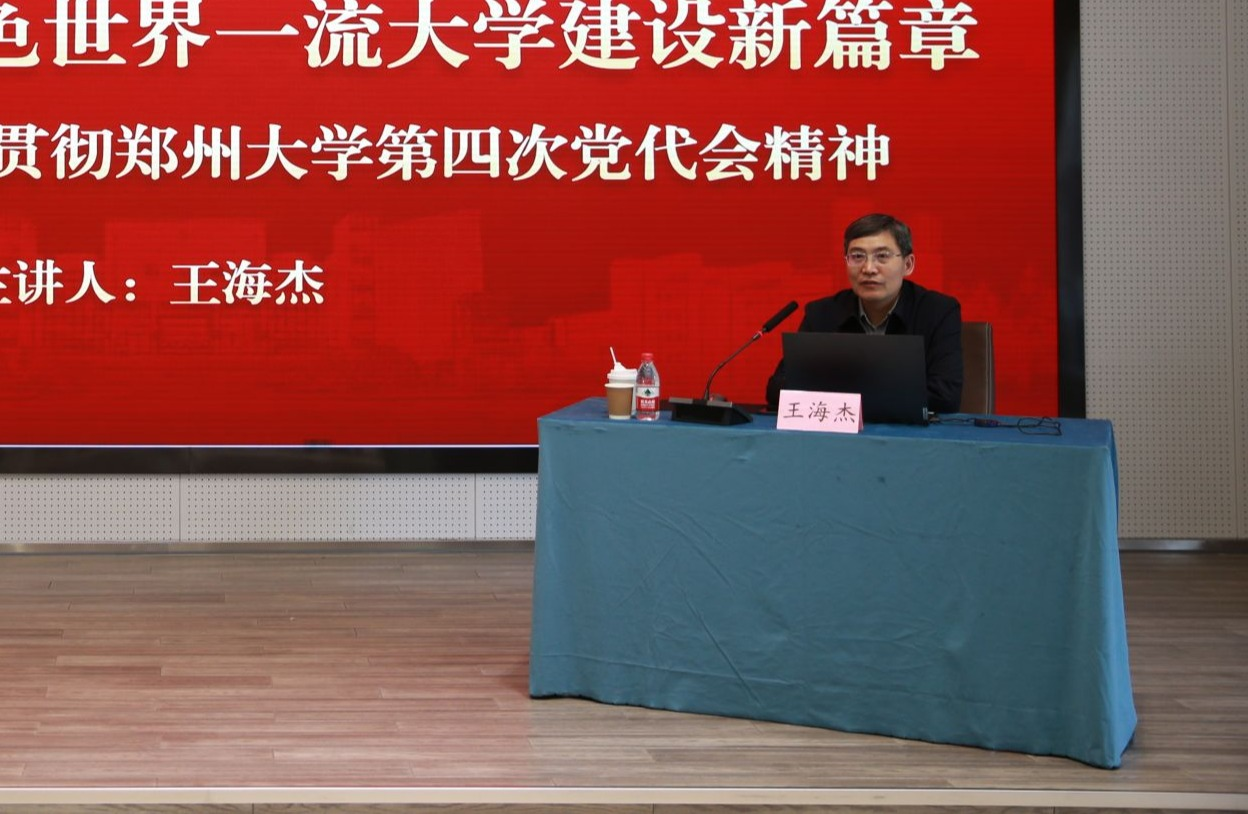 会上,王海杰带领学院师生共同回顾了郑州大学自合校以来的奋进历程以及第三次党代会以来学校在人才培养、学科建设、服务国家战略等方面取得的突出成绩。他强调,要进一步全面把握一流大学建设新形势,明确今后五年的总体工作思路,锚定“一个总目标”,把握“三个节点”,做到“五个更高”,坚持“三个必须”,推进“七个坚定不移”,统筹落实“九大任务”,并提出要把学习贯彻郑州大学第四次党代会精神和推动学院高质量内涵式发展紧密结合,坚持全球视野、中国情怀,统筹做好“引进来”和“走出去”两篇大文章,推进高水平开放办学,守正创新,开拓进取,奋力谱写中国特色世界一流大学建设新篇章。