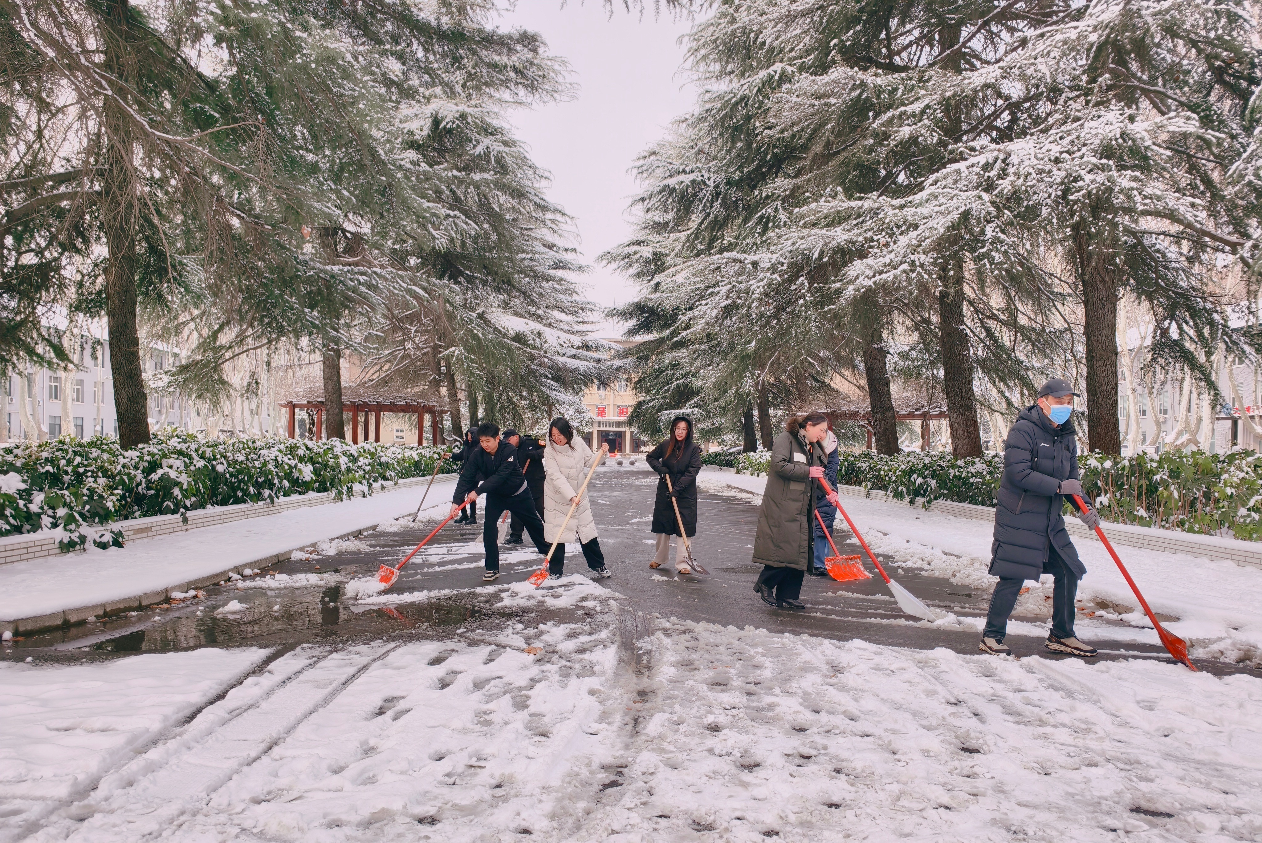 在清雪行动中,学院教职工不畏严寒,手持铁锹、雪铲等工具,分工协作、默契配合,重点对办公楼前、人行主次干道等师生通行密集区域进行集中清理。行动期间,党员教职工切实发挥带头作用,以实际行动践行责任担当。经过数小时的努力,相关区域的路面积雪与暗冰得到有效清除,行人通道恢复安全畅通。