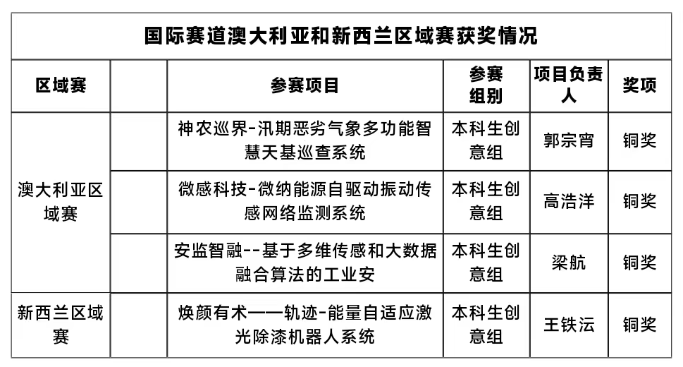 自今年4月大赛启动以来,学院积极筹备,广泛宣传动员、制定科学选拔方案,为“4+0”中外双学籍学生参赛提供支持和保障,联合校内外专家对申报项目多轮指导打磨。这份亮眼答卷的背后,是参赛学子深耕钻研、勇于创新的坚守,更是指导教师用日夜陪伴书写责任的双向奔赴。另悉,我院在澳大利亚区域赛中获得银奖1项,铜奖3项;在新西兰区域赛中获得银奖1项,铜奖1项。国内高教主赛道、“青年红色筑梦之旅”赛道中获省赛一等奖2项,二等奖2项,三等奖1项。