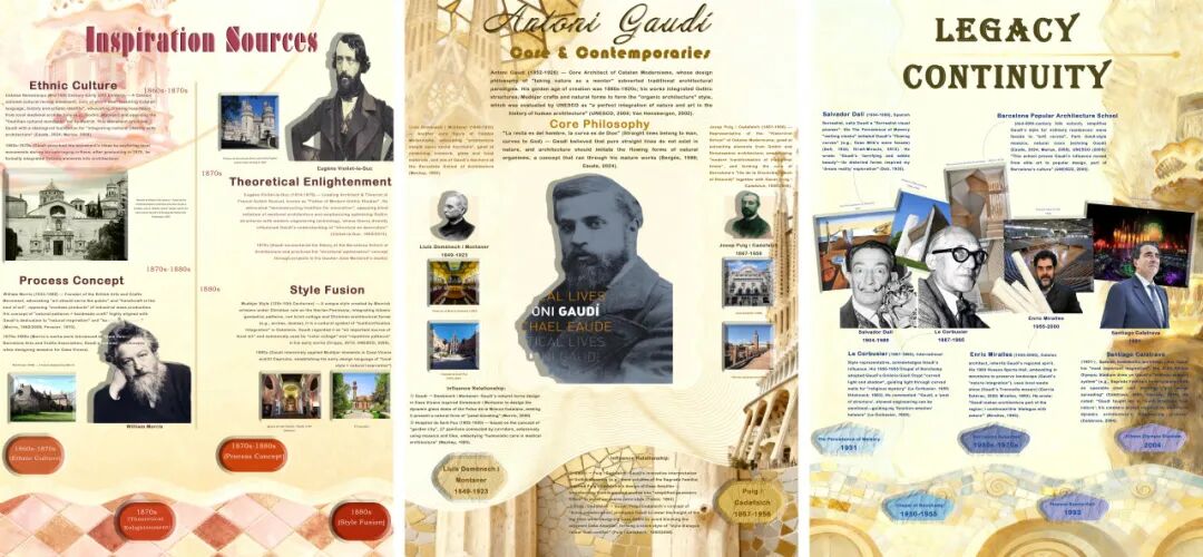 作品介绍:该海报以建筑师安东尼·高迪(Antoni Gaudí)“自然形态建筑”理念为核心。设计从其“直线属于人类,曲线属于上帝”的信念出发,提炼出“自然主义”与“有机结构”两大关键点,并沿时间轴组织信息框架。在创作中,通过划分为“导师-同代人-继承者”三个独立板块,运用差异化的色块与线条标识不同时期;同时将建筑作品图像与文字解说并置,清晰呈现了高迪自然主义理念从起源到发展的纵向脉络。