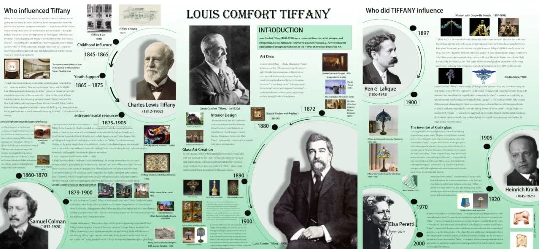 作品介绍:本海报聚焦于设计师路易斯·康福特·蒂芙尼(Louis Comfort Tiffany)的艺术世界,以其“自然肌理为骨、跨艺融合为魂”的创作哲学为核心线索,系统梳理其多元融合的灵感体系——既承袭其父亲的精湛工艺,亦汲取爱德华·科尔曼的色彩理论,并融汇东方美学与新艺术运动的风格碰撞。从虹彩 Favrile 玻璃到自然曲线提炼,从珠宝精度到玻璃革新,不妨循着“少即是美”的设计逻辑,让植物叶脉、昆虫翅影化作线条,用材质碰撞(金属与玻璃、珐琅与宝石),在古典与现代间,勾勒兼具奢华质感与自然温度的创作。