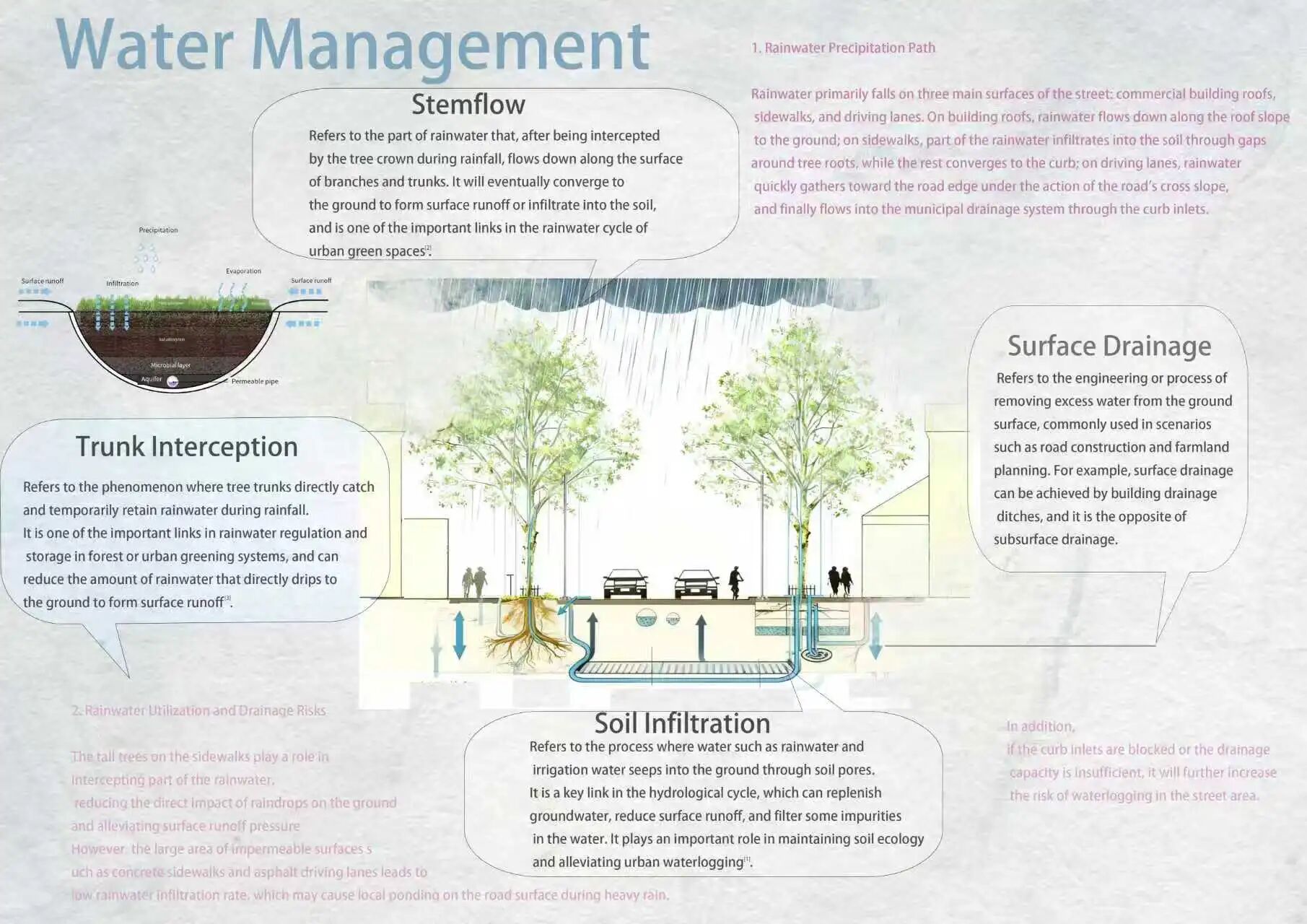 作品介绍:该项目以郑州市桃源路中段(桃源南街-勤劳街)为研究对象,旨在通过生态化改造提升街道的可持续性与空间质量。设计理念以“海绵城市”为核心,整合雨水管理、交通优化与景观生态,形成“生态-交通-空间”三位一体的街道更新策略。设计者通过功能分区、交通流与透水率等数据,诊断出传统硬质铺装导致的积水风险、非机动车道缺失与树种功能不明确等问题。进而,在雨水管理层面,提出“树茎径流-土壤渗透-透水铺装”的三级雨洪调控体系。最终,通过功能复合的空间分配,将学校、商业与公共交通无缝衔接,使街道既满足学生、居民的通勤与生活需求,又实现生态效益与空间品质的双重提升。