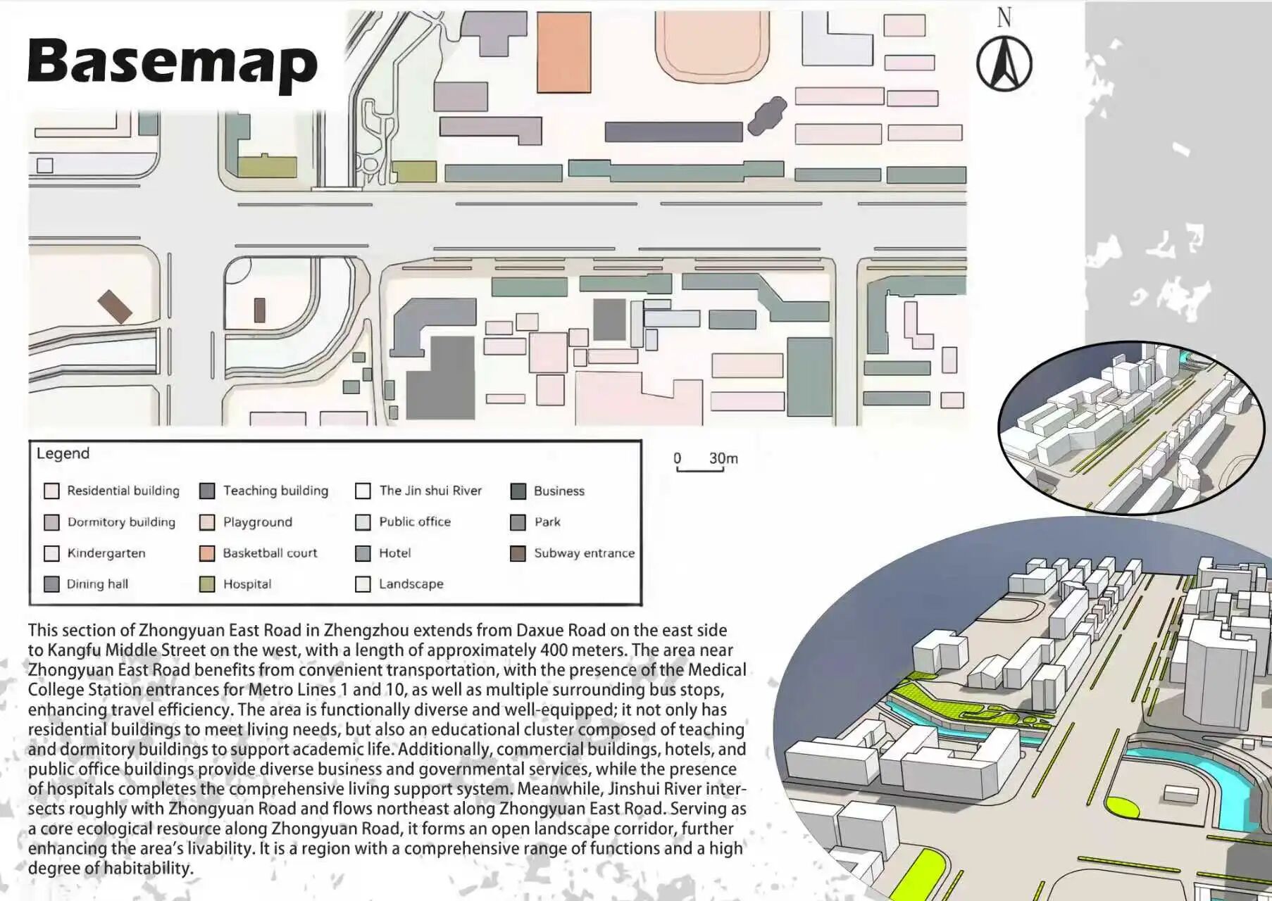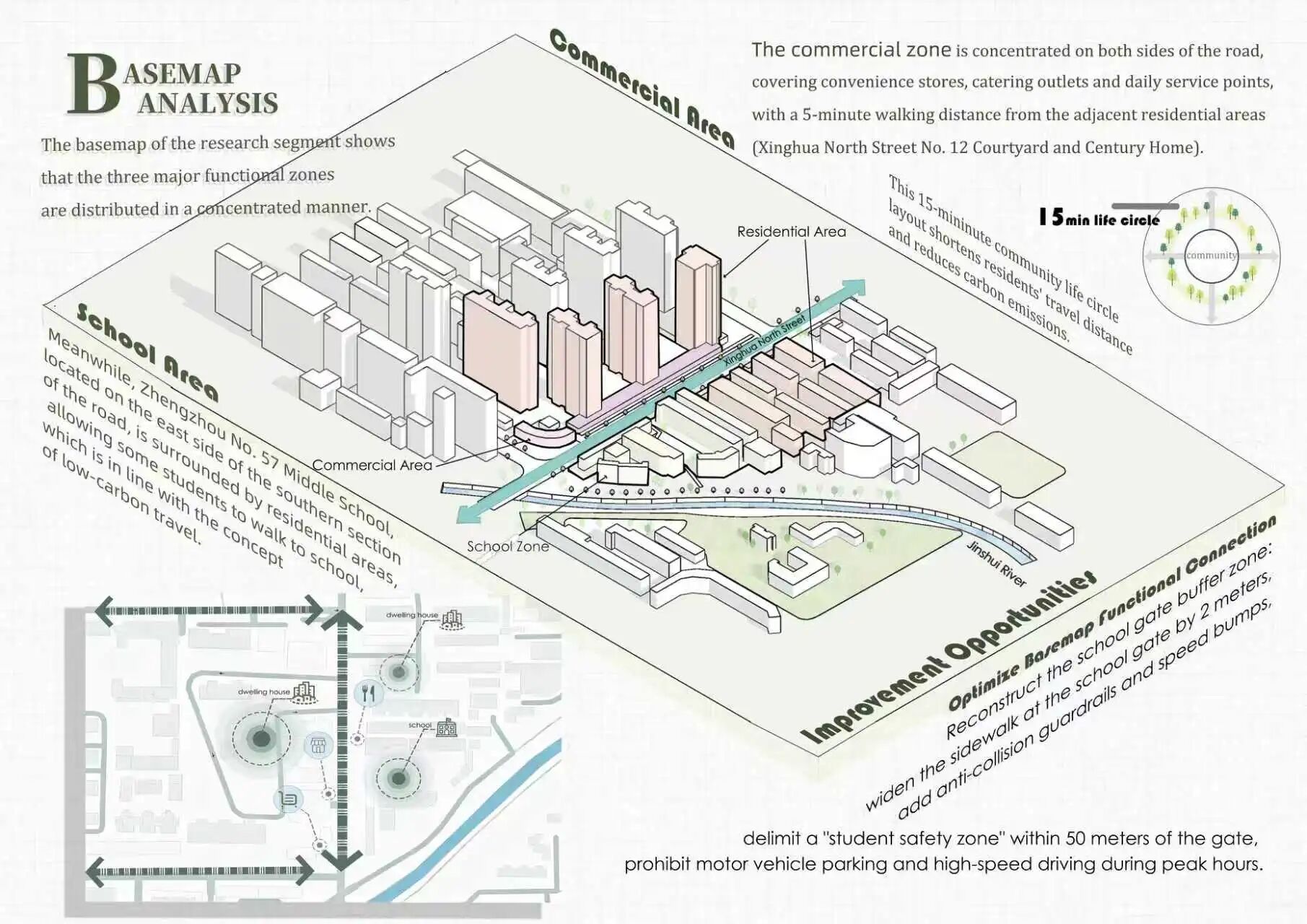作品介绍:本项目聚焦郑州二七区兴华北街核心路段,围绕基底功能布局、交通系统及水循环管理三大核心维度,开展可持续更新优化,为同类城市道路转型提供实践参考。基底功能布局上,路段商业、居住、教育三大功能集中分布,构建起高效的15分钟社区生活圈,但存在功能衔接不足的问题。项目将通过拓宽校门人行道、设置安全区等方式,强化功能过渡与出行安全。交通系统方面,优化方案包括高峰时段交通疏导、增设违停抓拍设备,划定专属停车区域,保障通行秩序。水循环管理方面,项目将通过新增雨水口、铺设透水沟渠、推广绿色屋顶等措施,提升雨水渗透与循环效率,完善海绵城市功能。