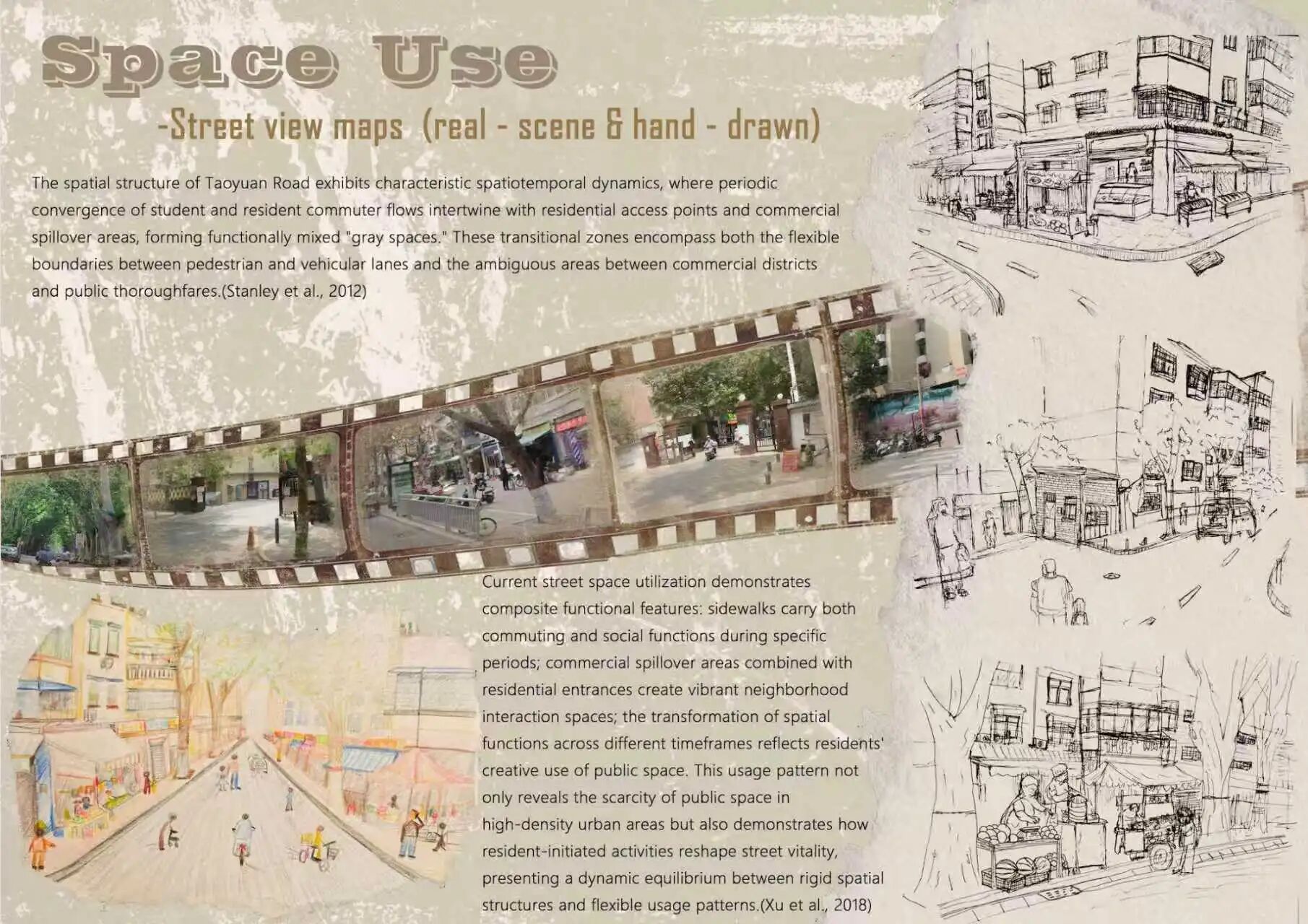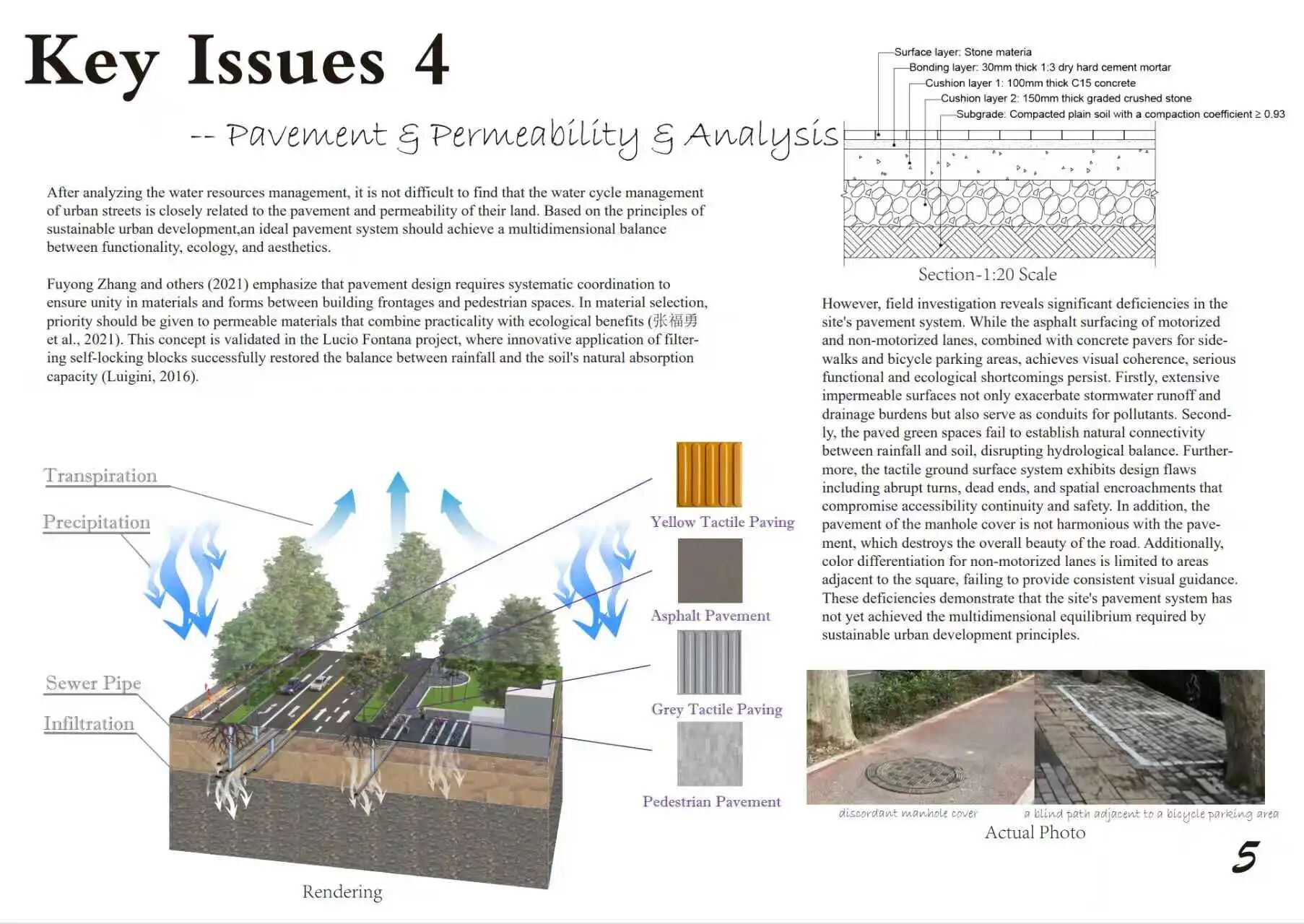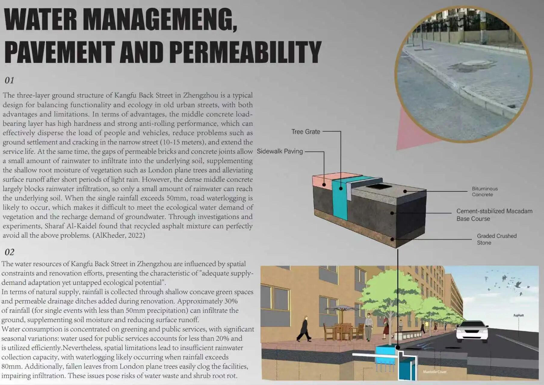 作品介绍:本项目针对郑州兴华北街,从用地、交通、铺装三方面进行可持续性分析。现状为功能混合但分区稍显僵化;交通基本完整但经常拥堵;铺装统一但透水性有待提升。基于此,提出三项核心改造策略:一、打破用地壁垒,促进商住融合,增补绿地;二、优化交通系统,贯彻“人先于车”,完善照明与停车;三、全面升级为透水铺装,并系统性规范盲道与井盖布局。旨在通过人本生态设计,协同提升街道的功能、安全与生态效益。