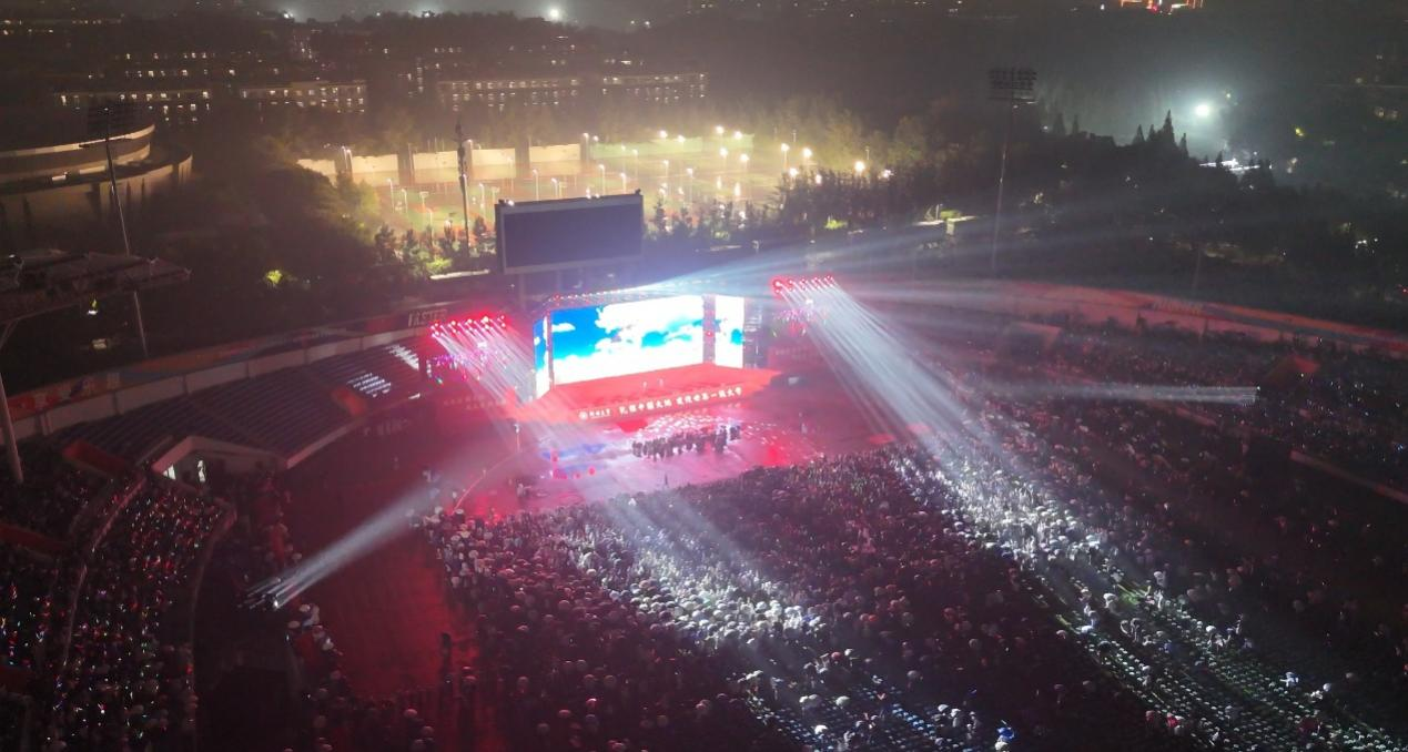 9月26日晚,郑州大学2025年庆国庆暨迎新生文艺晚会在主校区本源体育场举行。校党委副书记王利国出席,相关职能部门和学院负责同志,一万余名2025级新生欢聚一堂,在雨幕中共赴这场充满活力的青春之约。