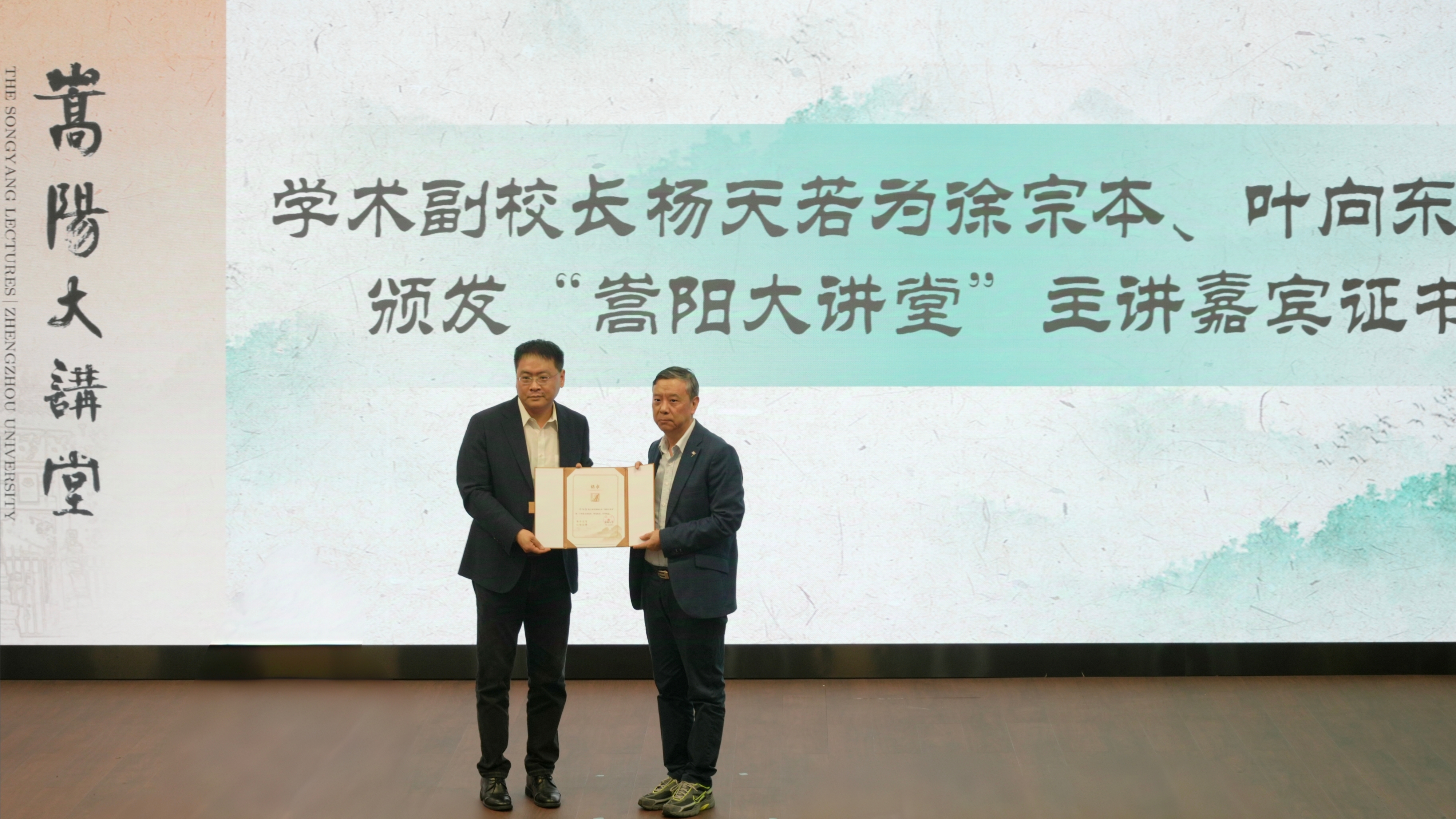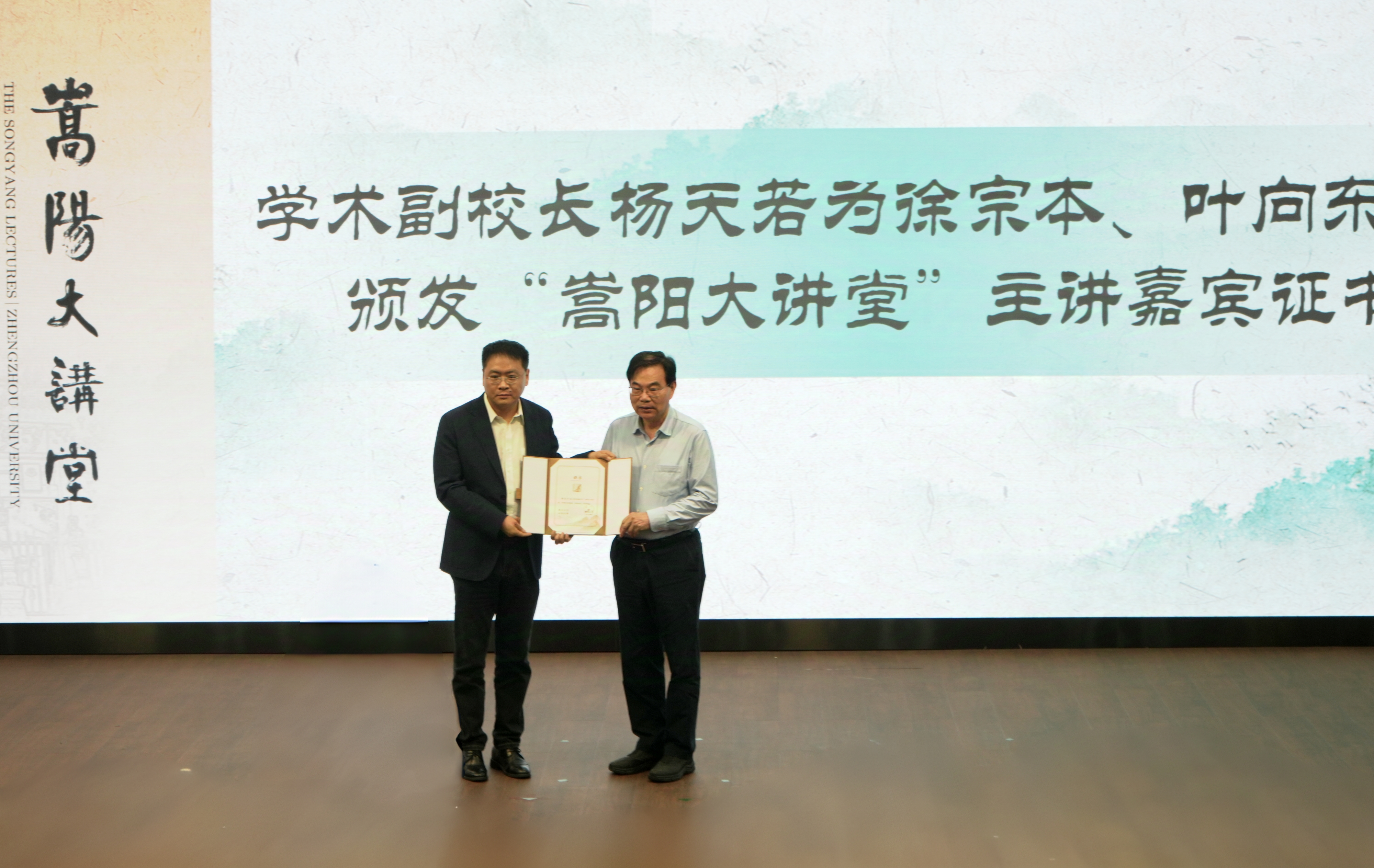 杨天若为徐宗本、叶向东颁发“嵩阳大讲堂”主讲嘉宾证书。