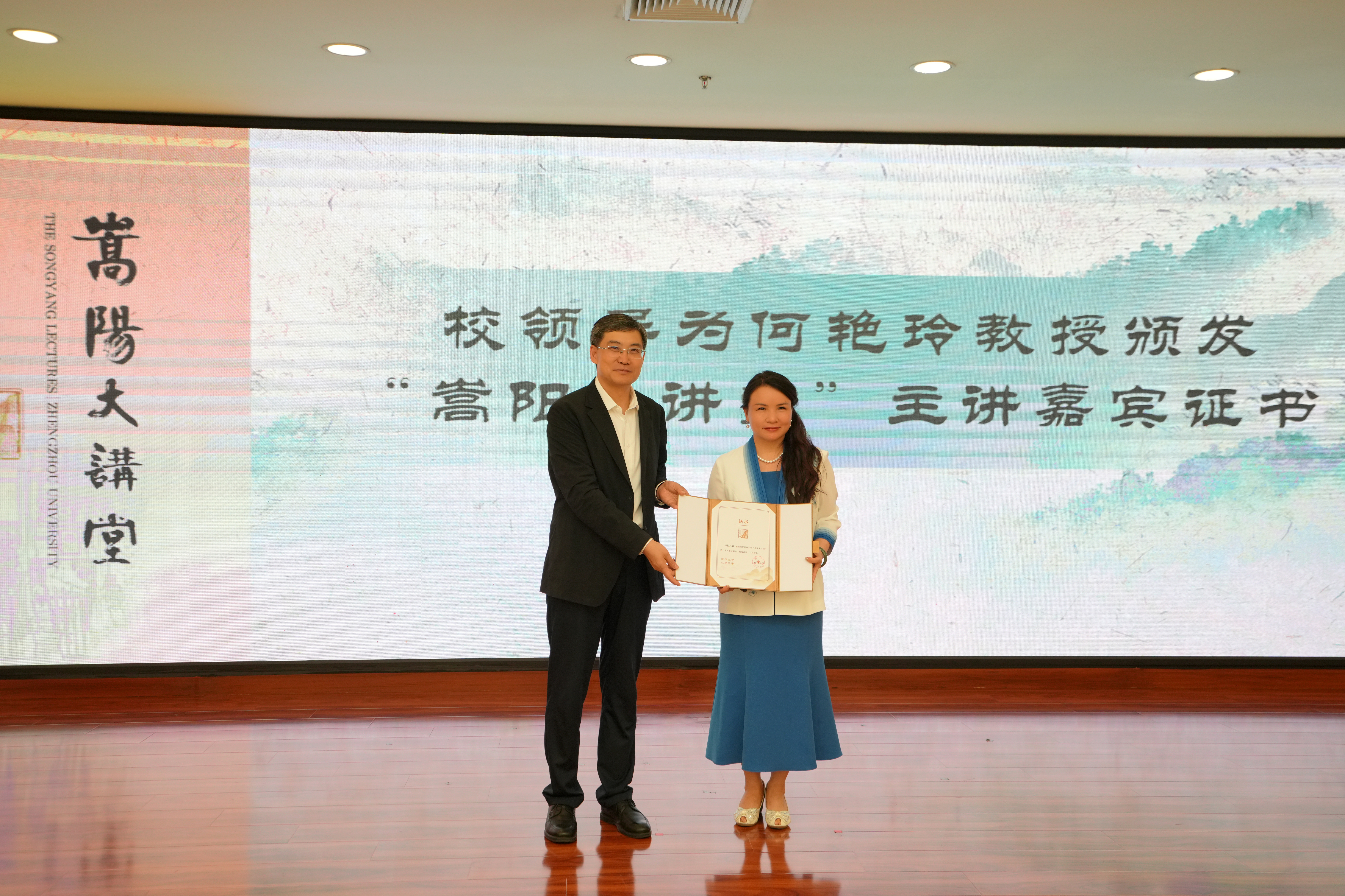 王海杰为公共管理学知名学者、中国人民大学吴玉章讲席教授何艳玲颁发“嵩阳大讲堂”主讲嘉宾证书。