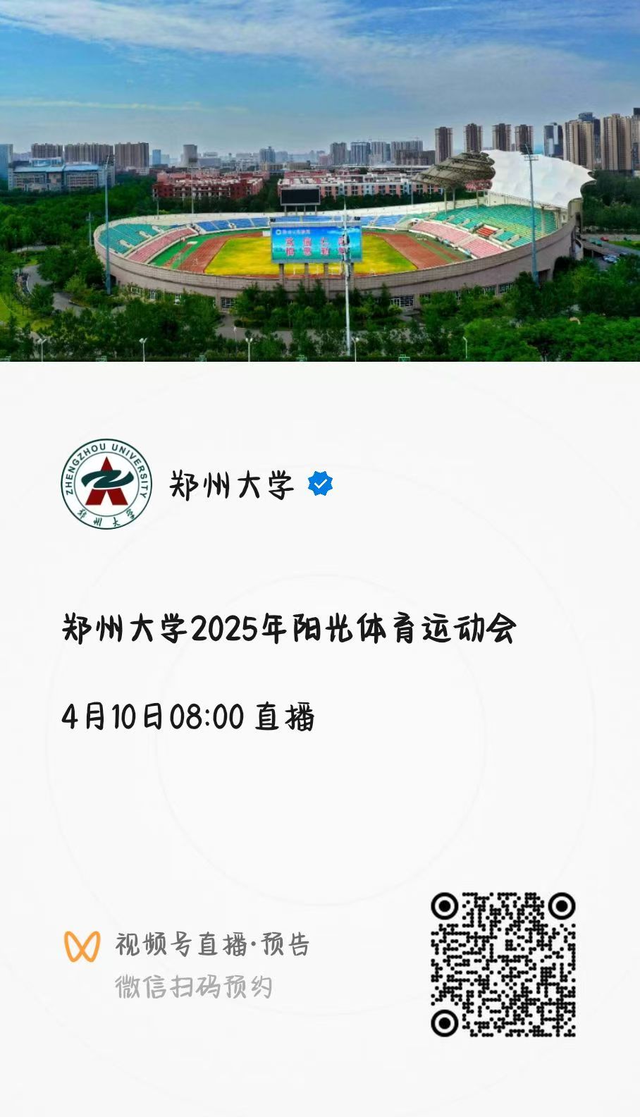 郑州大学2025年阳光体育运动会开幕式将进行线上同步直播,全景展现运动会盛况。欢迎广大师生、校友及家长届时收看。
