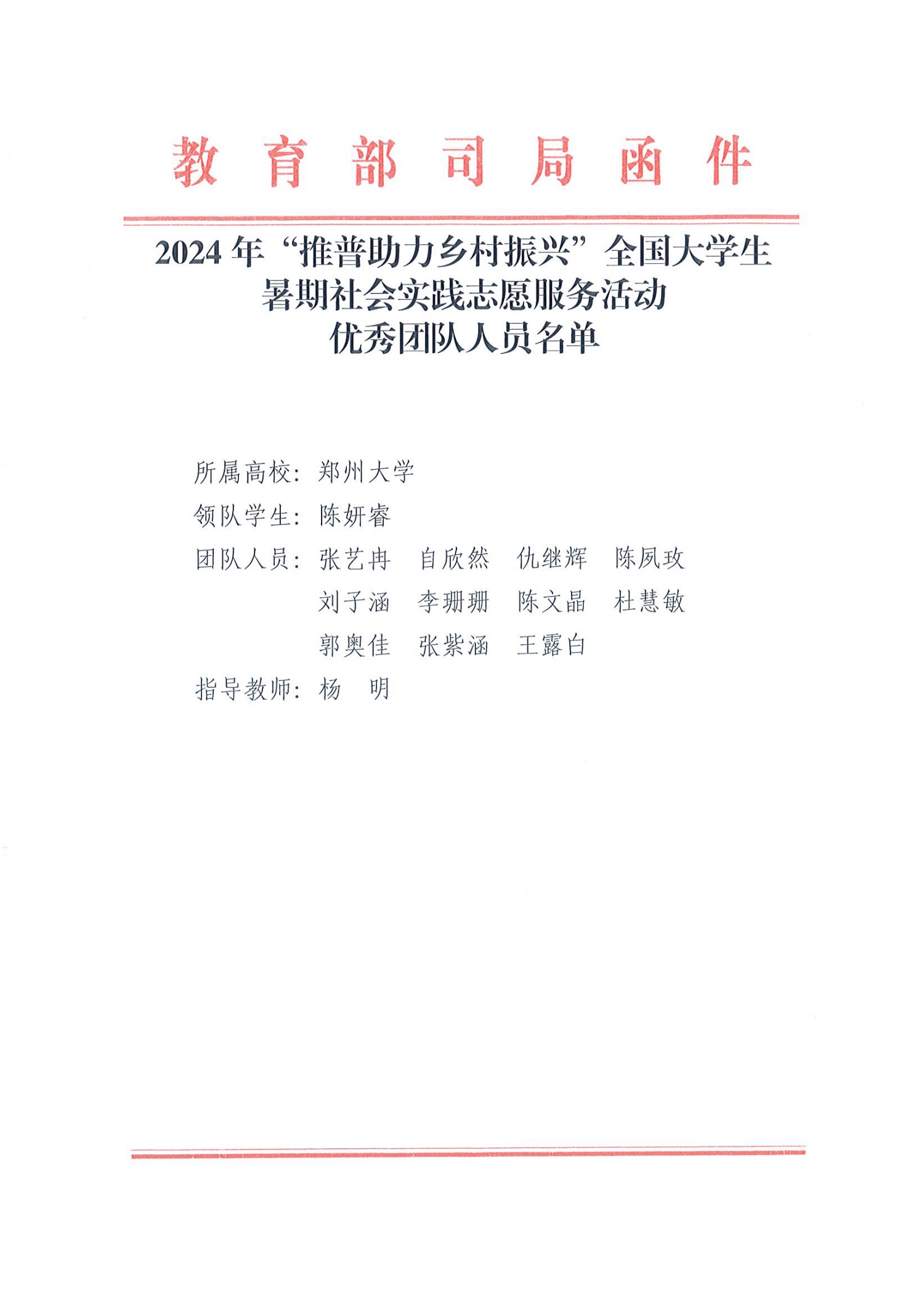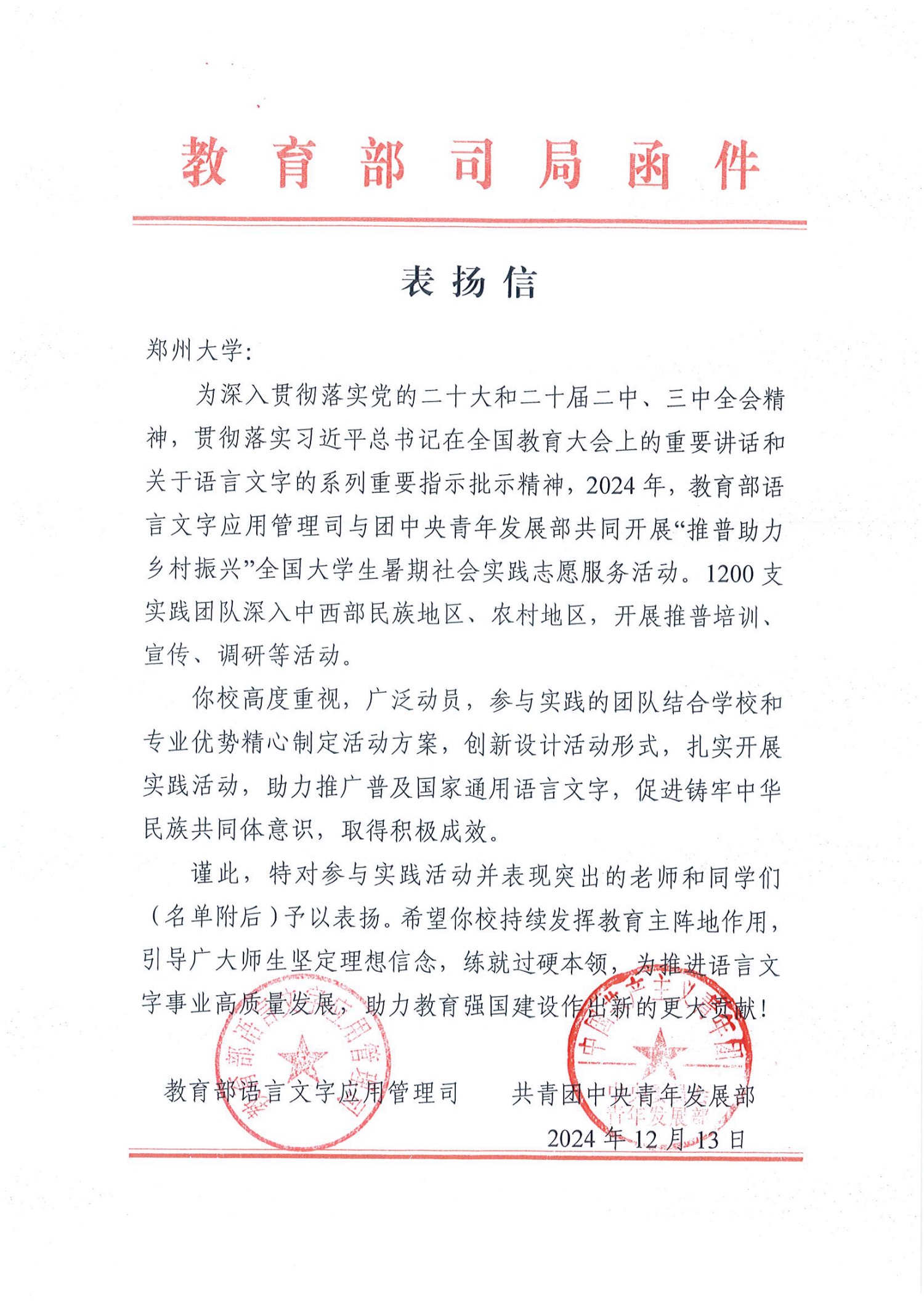 日前,教育部语言文字应用管理司和共青团中央青年发展部向郑州大学发来表扬信,对郑州大学师生在2024年“推普助力乡村振兴”全国大学生暑期社会实践志愿服务活动所作出的积极贡献予以表扬。这也是郑州大学又一次获教育部和团中央来信表扬。
