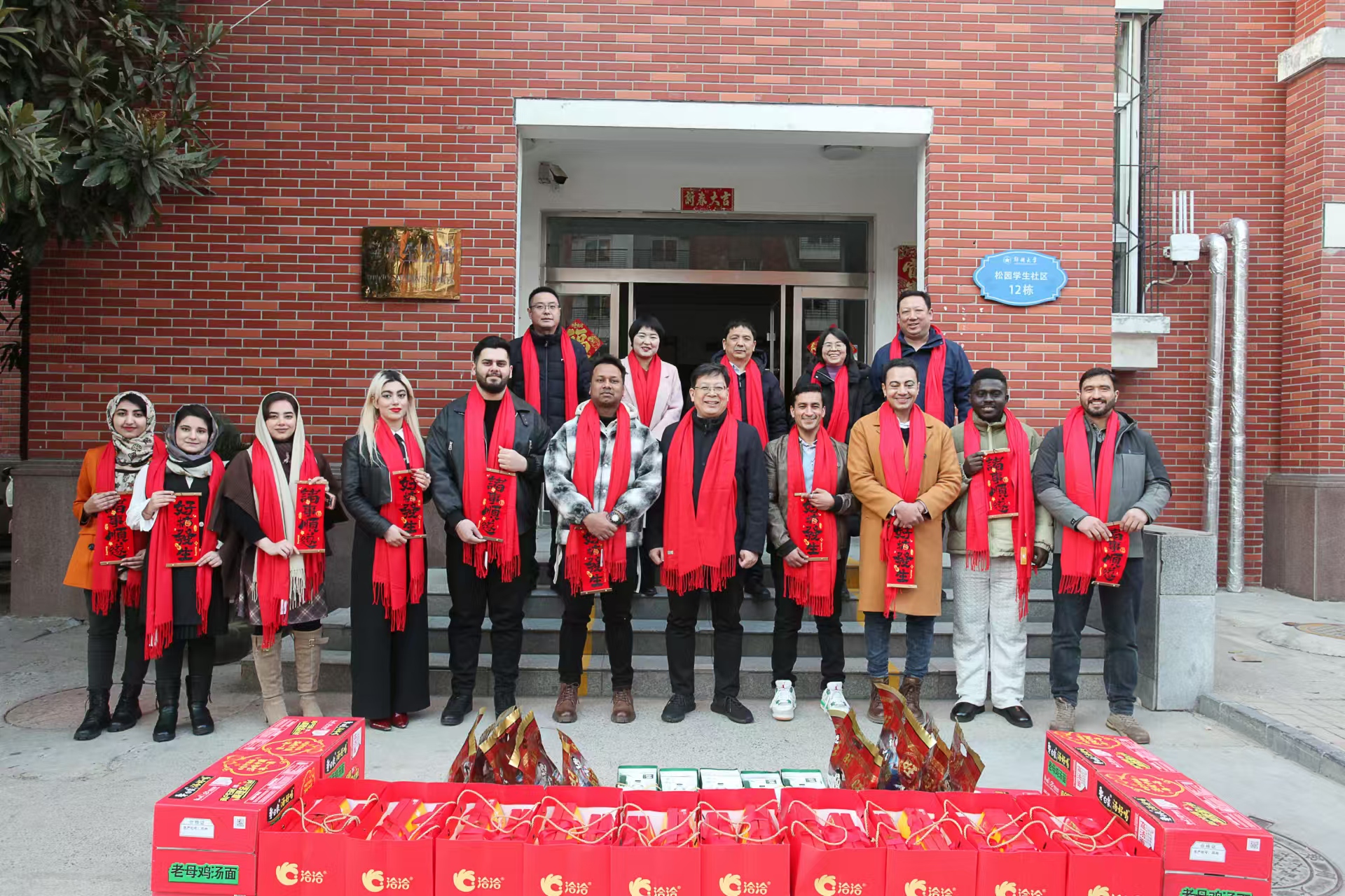 在松园12号楼,王利国为留学生代表送上寓意“好事发生”的福贴和新春慰问品,指出今年中国春节正式成为世界非物质文化遗产,不仅是中华儿女的团圆节日,更是全人类共同的文化财富,希望大家深入感受中华优秀传统文化,积极传播中国故事和郑大故事,为深化中外文化交流贡献力量,并祝福同学们在郑大度过一个平安祥和的“中国年”。