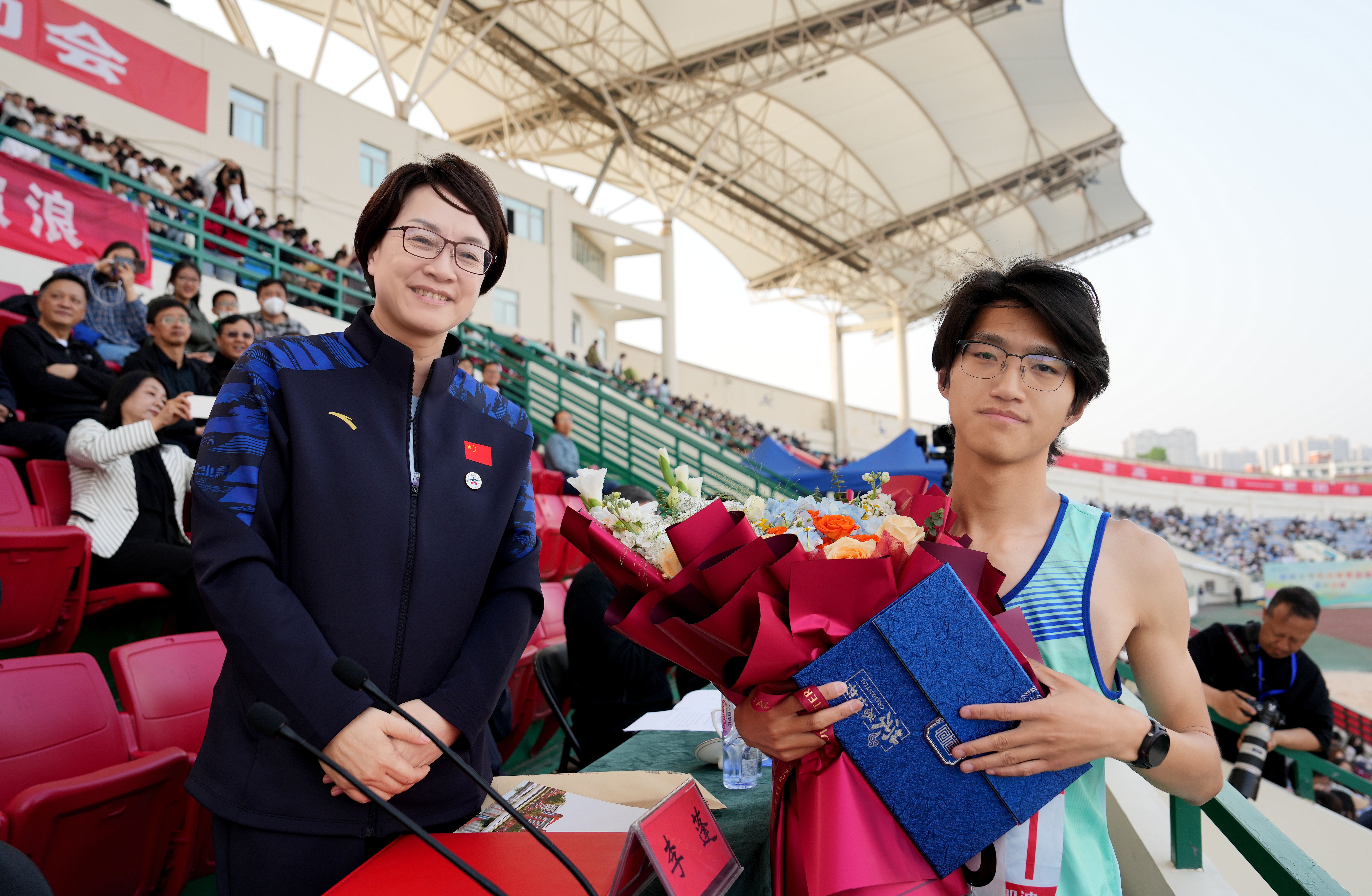 李蓬为吕亚博同学颁发打破校运会记录特别纪念证书