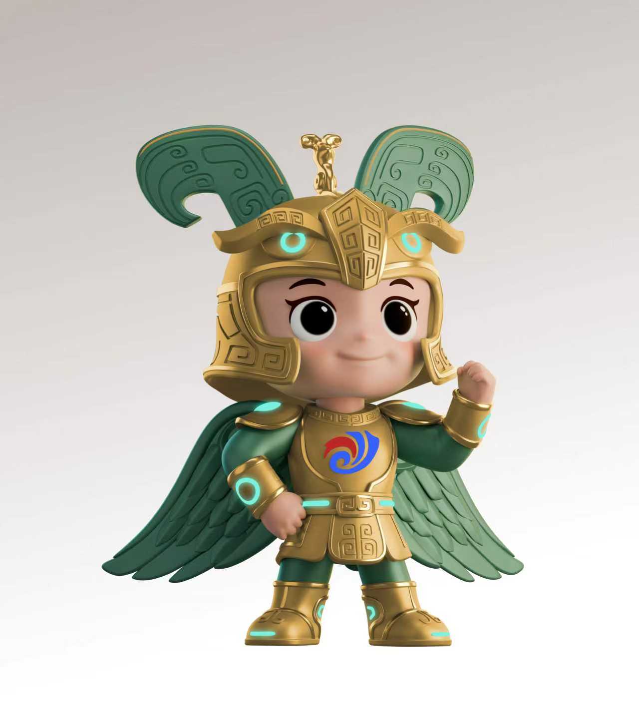 3.翅膀灵感源自“妇好鸮尊”的羽翎纹螺旋羽翼,象征守护与飞跃,寓意青年敢于展开梦想之翼,勇敢闯创、乘势而上;