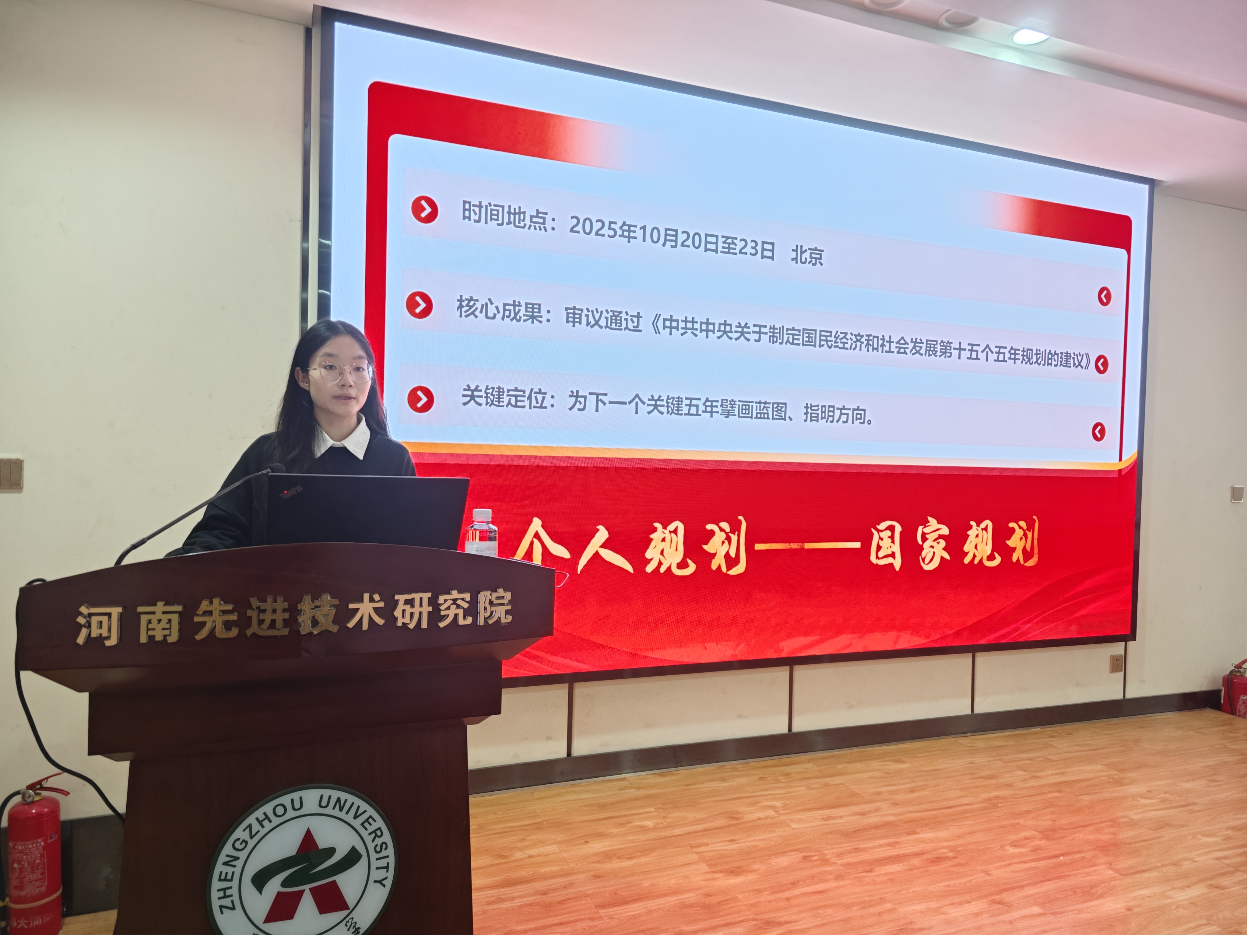 整场宣讲内容翔实、案例鲜活、贴近青年,既有理论高度又有实践温度,现场互动热烈、反响强烈。与会学生纷纷表示,此次宣讲让全会精神真正入脑入心,不仅深化了对“十五五”时期发展意义的理解,更增强了“强国有我”的责任感与使命感。大家一致认为,作为新时代青年科研工作者与学习者,将自觉把个人理想融入国家发展大局,立足专业领域锐意进取,以过硬本领和务实行动为强国建设、民族复兴贡献青春力量,为谱写中原大地中国式现代化新篇章添砖加瓦。