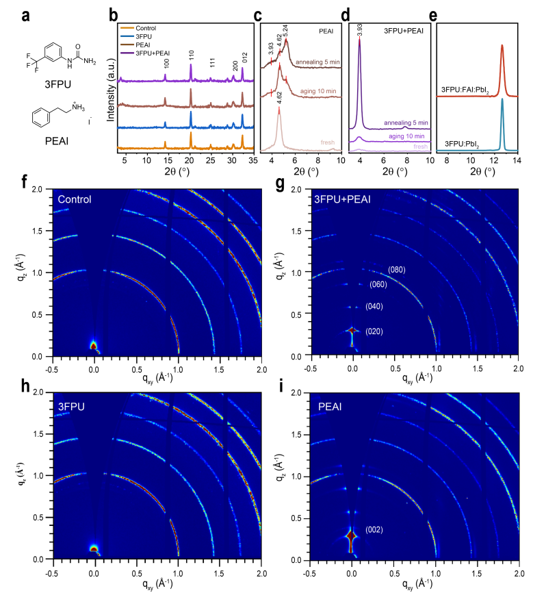 宽带隙钙钛矿在叠层光伏器件中具有重要应用前景,然而传统表面处理策略常导致二维钙钛矿结构不均、相态演变不稳定等问题,制约器件性能与稳定性。本研究创新性地提出了一种基于PEAI与3FPU的双分子协同后处理策略,通过分子间相互作用与局域极性调控,实现了在钙钛矿表面构建均匀的n=2二维钝化层。
