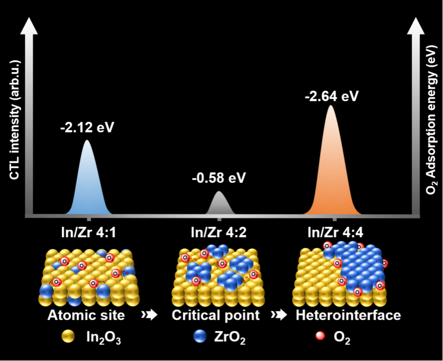 其识别原理是利用乙醚触发发光现象,能够快速准确识别从痕量到当量Zr掺杂In2O3(In2O3/ZrO2)催化剂中原子位点到异质界面的“临界点”。研究结果表明,该临界点处发光信号显著减弱,这归因于其较低的氧吸附能;相反,具有较高氧吸附能和氧活化能力的原子位点及异质界面则产生强催化发光。据此,本研究基于In2O3/ZrO2独特的“on-off-on”探针发光模式,可特异性识别金属氧化物催化剂上精细结构转变的临界点。实验与理论计算证实了发光强度差异与氧吸附/活化能力之间的直接关联。此外,本研究建立的发光识别方法可拓展至其他金属氧化物体系(In2O3/CeO2和ZnO/ZrO2),为快速识别催化剂关键活性位点提供了新的技术手段。本方法有望替代传统的高分辨率透射电子显微镜技术,有助于科研人员更好地理解和调控催化剂的活性结构,从而推动催化科学的发展。该研究得到了国家自然科学基金重点项目、河南省自然科学基金等项目的支持。