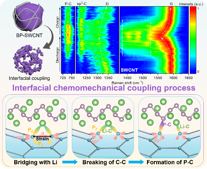 该研究首次证明了通过仅掺入1 wt% SWCNT,应变诱导界面稳定策略在磷基负极中是可行且高效的。原位拉曼光谱直接捕捉了锂化/脱锂过程中SWCNTs拉伸应变的演变,以及缺陷sp3碳和界面P-C键的出现。结合密度泛函理论DFT计算,阐明了应变和锂化磷簇在驱动该化学机械耦合过程中的关键作用。这种界面耦合不仅实现了粉化磷簇的原位稳定,还有效抑制了LiPPs的溶解和穿梭。同时,重构的电极形成了坚固的三维互连导电网络,显著增强了反应动力学和循环稳定性。因此,仅使用少量1 wt% SWCNT,黑磷(BP-SWCNT)负极表现出优异的性能,在0.1C下提供1981.6 mAh g⁻1的容量,在5C下为1235.6 mAh g⁻1,并在1C下循环500次后保持1301.9 mAh g⁻1(78.1%)。具有507 Wh kg⁻1高能量密度的NCM811//BP-SWCNT全电池在1C下循环500次后甚至能保持其容量的72.5%。该研究不仅为解决磷基负极的内在挑战提供了新视角,还证明了应变介导的界面设计原则对广泛的高体积膨胀电极材料具有普遍的指导意义。