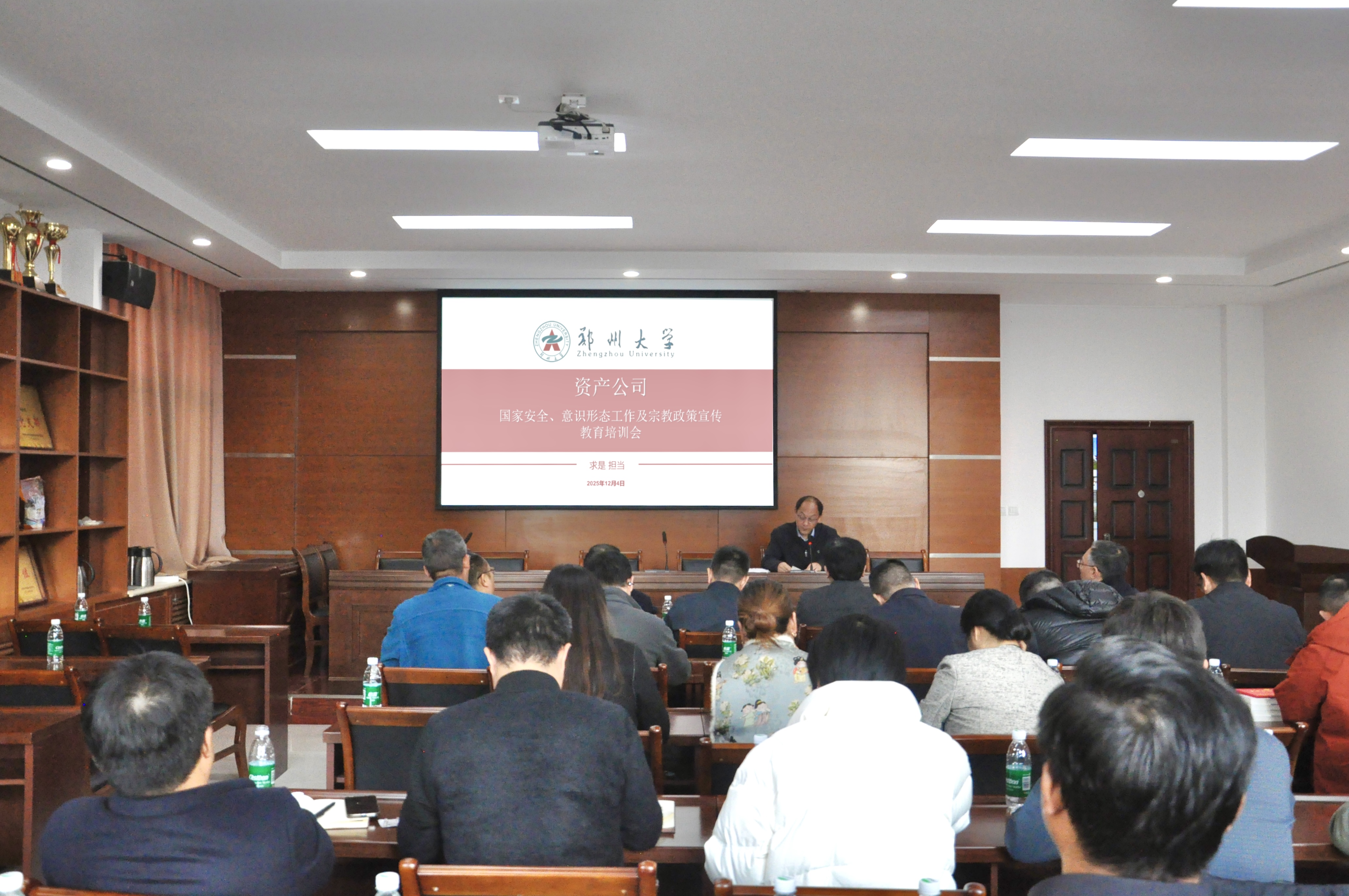 为深入学习贯彻习近平新时代中国特色社会主义思想,全面落实总体国家安全观,进一步强化公司全体干部职工的国家安全意识、意识形态阵地管理能力和宗教政策理解水平,12月4日,资产公司在三楼党建活动室组织召开国家安全、意识形态工作及宗教政策宣传教育培训会。公司领导班子成员、各基层党支部书记、各所属企业中层以上管理人员、机关全体职工40余人参加培训,会议由副总经理郎亚东主持。