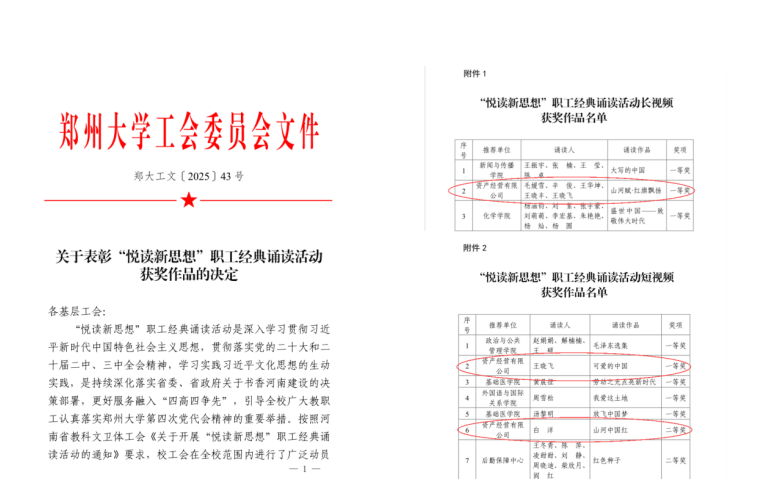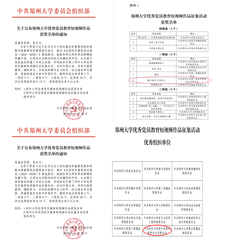 近日,郑州大学优秀党员教育短视频征集及“悦读新思想”职工经典诵读活动评选结果相继揭晓,郑州大学资产经营有限责任公司选送的作品凭借扎实的创作实力与深厚的文化底蕴,在两项活动中脱颖而出,斩获多个奖项,在优秀党员教育视频征集活动中,资产公司提交的作品荣获一等奖、资产公司被评为优秀组织单位;在职工经典诵读活动中,公司提交的作品荣获两个一等奖、一个二等奖。
